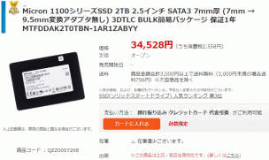 NTT-X Storeにて2.5インチの2TB SSD「MTFDDAK2T0TBN-1AR1ZABYY」が期間限定特価34,498円、送料無料で販売されています。
