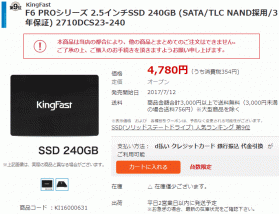 現在KingFast製の2.5インチ7mm厚の240GB SSD「2710DCS23-240」は期間限定特価4,780円、送料無料で販売されています。
