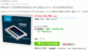 現在Crucial(Micron)製の2.5インチ7mm厚の500GB SSD「CT500MX500SSD1/JP」はソフマップ.com、Joshin Web(楽天)、TSUKUMOにて新春特価7,322円、送料無料で販売されています。