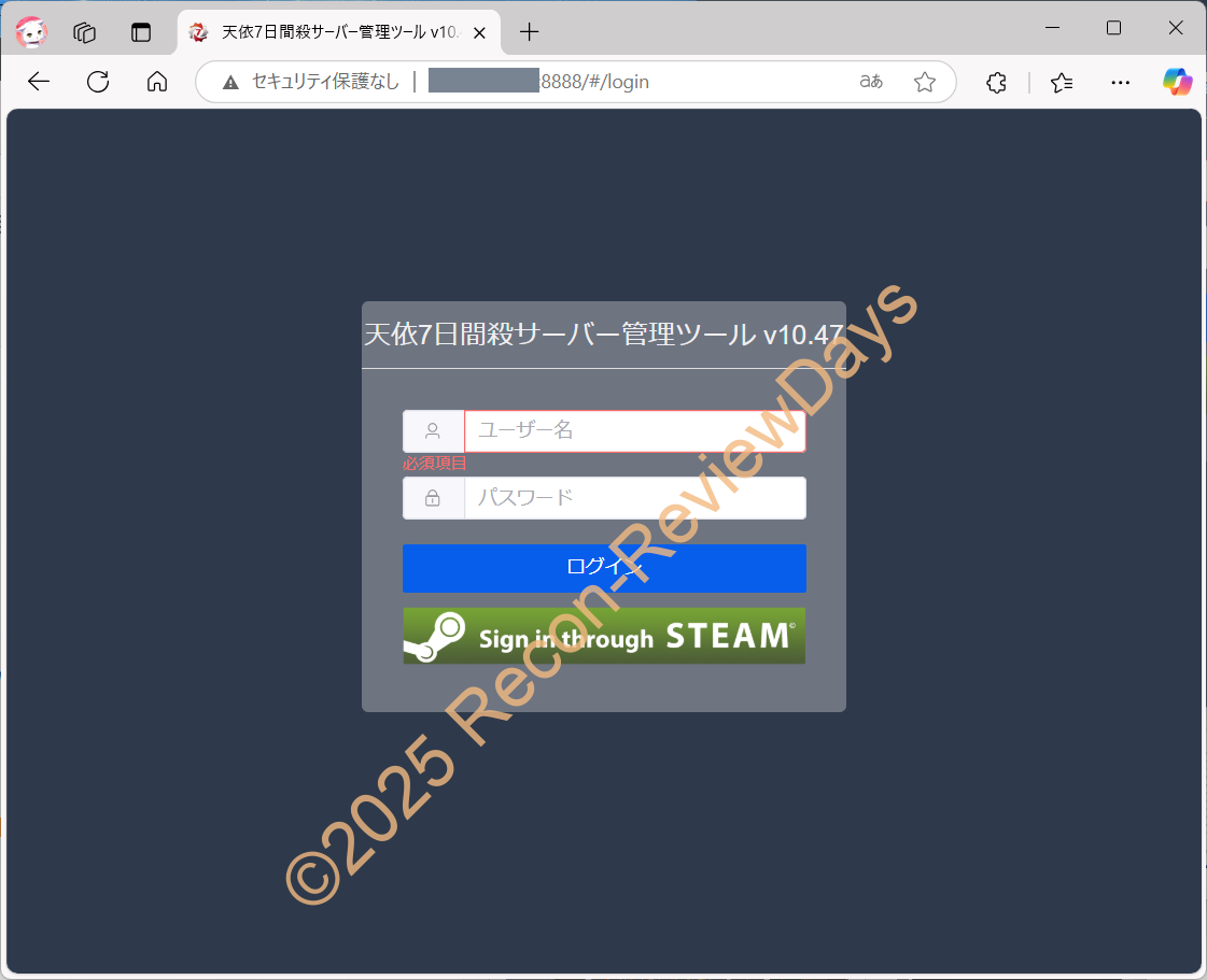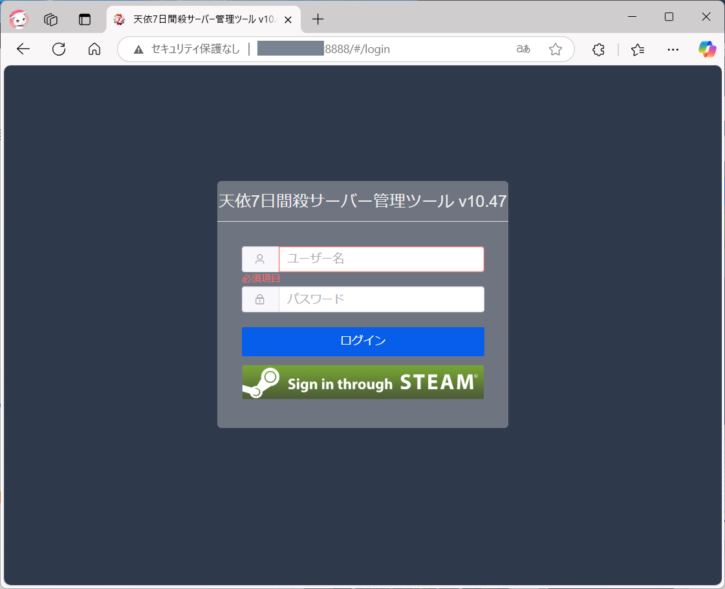 「TianYi 7 Days to Die Server Tools」にログインする場合のURLは「192.168.**.***(ローカルIP):8888」となっており、若干分かりづらいのでお間違いなく。