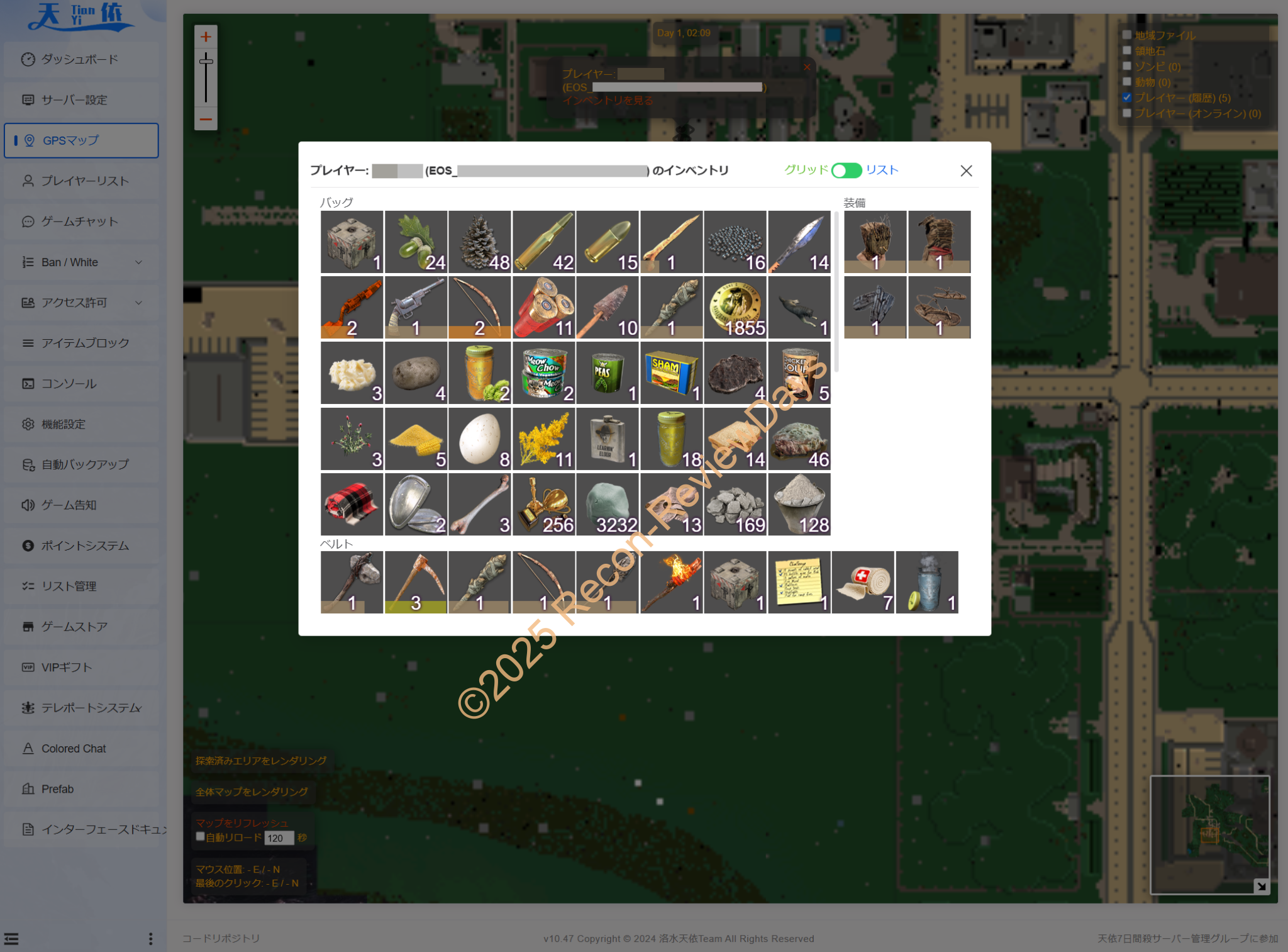 ・サーバーにログインしてきたユーザーのバックパック内アイテム、レベル、スキル等確認可能