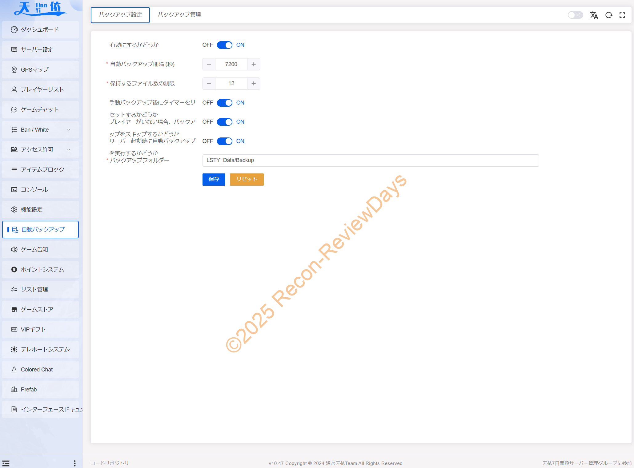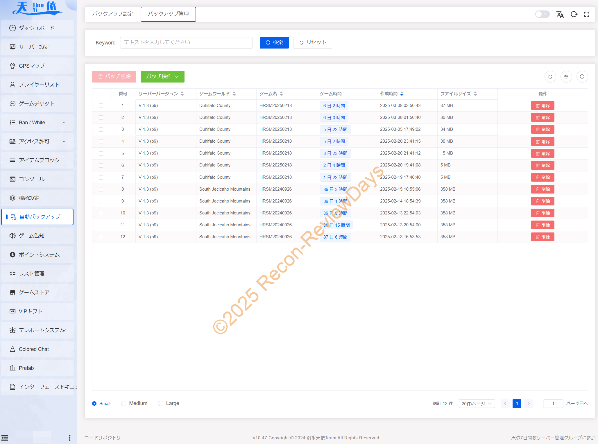 何気に自動バックアップ機能が搭載されており、ワールドデータのバックアップをバージョン、日付、ゲーム内時間等Webブラウザベースで管理できるのでポート開放していれば外部からでも確認が可能です。