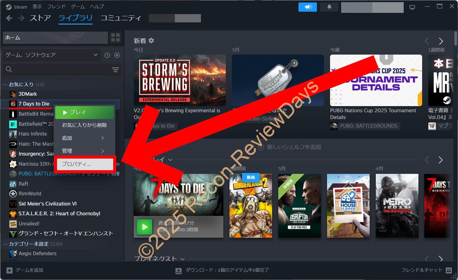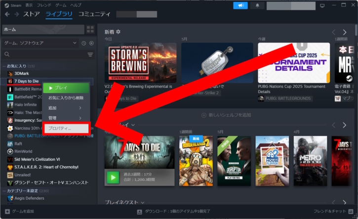 「Steam」を起動し、「ライブラリ」から「7 Days to Die」を「右クリック」→「プロパティ」を開きます。