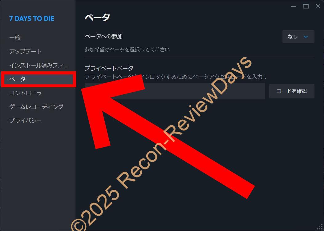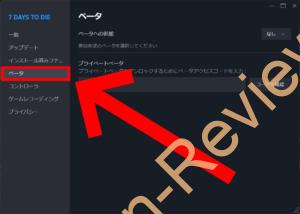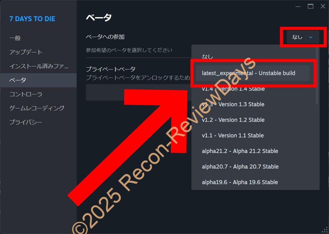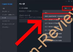 「7 Days to Die」の「ベータ」→「ベータへの参加」→「なし→latest_experimental – Unstable build」へ変更します。