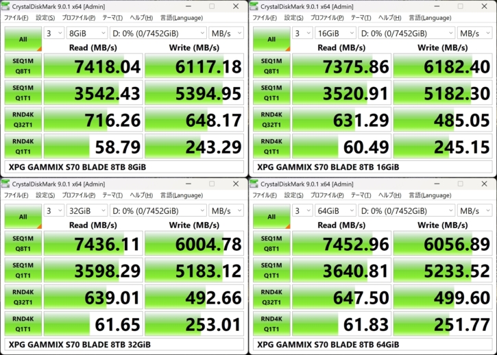 「CrystalDiskMark 9.0.1」でキャッシュサイズを「8/16/32/64GiB」、ヒートシンク有りの環境(MSI MPG X670E CARBON WI-FIのM.2_2(PCIe 5.0×4接続 ※PCIe 4.0×4設定、CPU接続))で検証してみました。