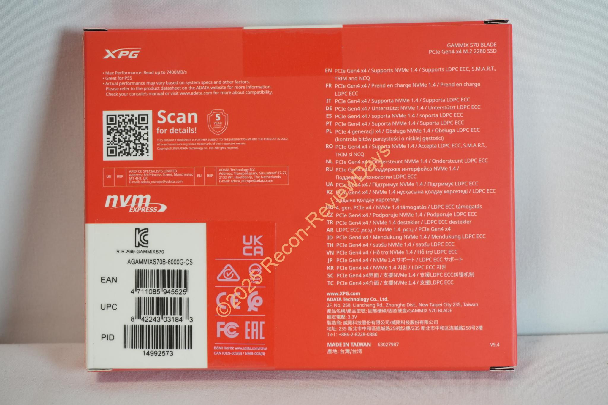 パッケージの表面、背面には「PS5対応、PCIe 4.0×4接続、3D NAND(TLC)、NVMe 1.4、SLC Caching、Advanced LDPC(エラー訂正機能)、DIY Heatsink(ヒートシンクの取付はユーザーが選択可)」と記載があり、他社に比べ分かりやすくなっています。