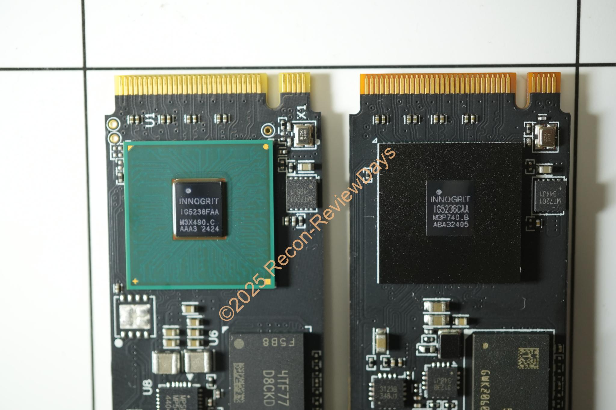 同時にレビューした「1TBモデル」の「AGAMMIXS70B-1T-CS」ではコントローラーのダイ周辺のデザインが異なり、コントローラーの8TBモデル(左側)は「IG5236FAA」でしたが、1TBモデル(右側)では「IG5236CAA」となっており、若干異なります。