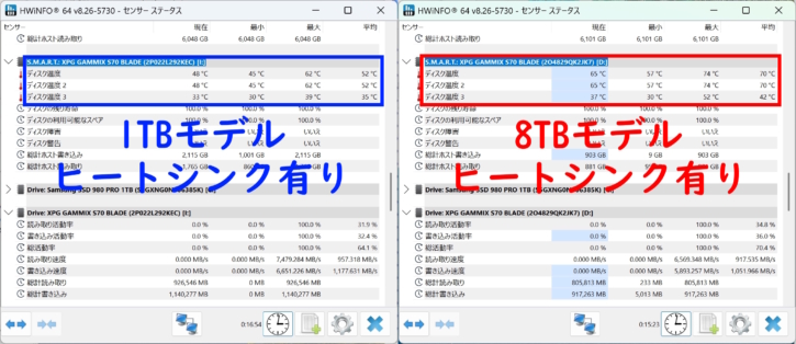 8TBという大容量の都合上、NAND自体がより積層数が増えており、発熱が大きくなる傾向があるのでヒートシンクの搭載は必須と言える結果になりました。