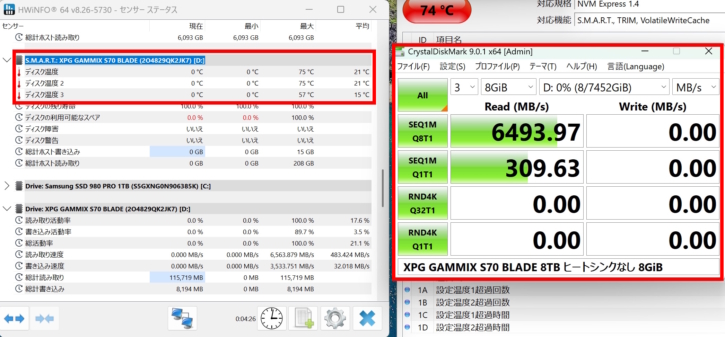 1TBモデルの「XPG GAMMIX S70 BLADE 1TB(AGAMMIXS70B-1T-CS)」と比較すると、アイドル時、ベンチマーク時に1ランク上の発熱が発生するため、付属のアルミシンク、もしくはマザーボードのヒートシンクに取り付け、風が当たる環境で利用することをお勧めします。