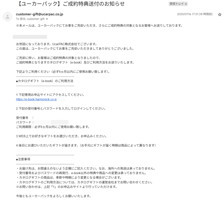 先日2年半乗った「NX350h F SPORT」を「ユーカーパック」の紹介URL経由で売却を行ったため、成約特典「カタログギフト(ebook)」がメールで届きました。