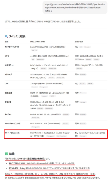 「ChatGPT」でスペックURLを比較させたところ、やはり「Wi-Fiが付属していないか、しているかの違い」という結果に。