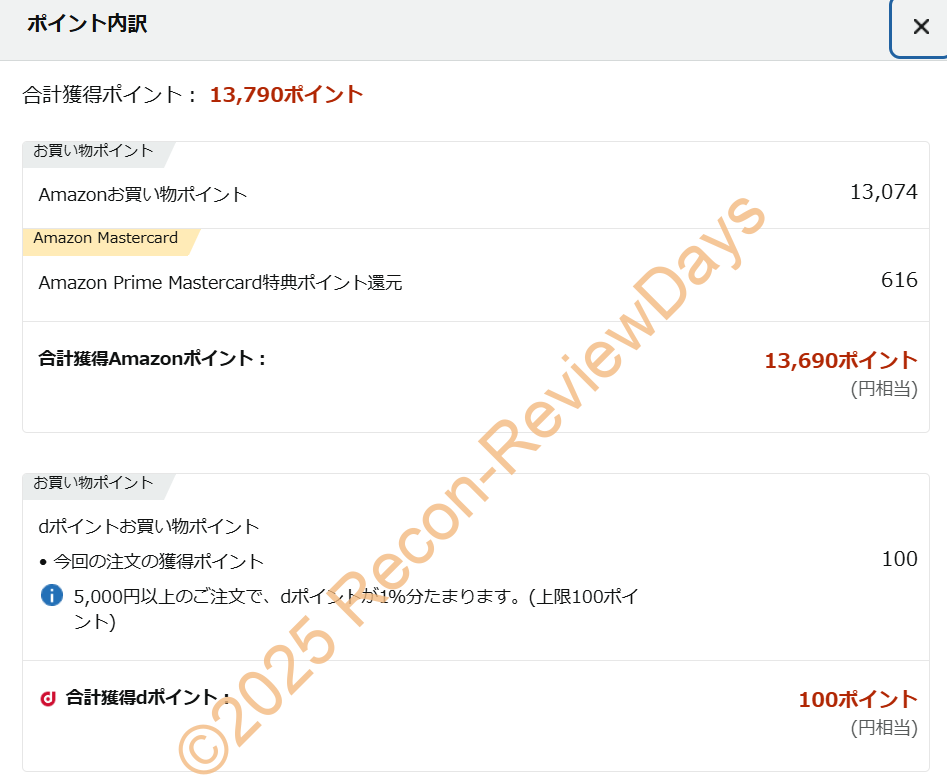 ※Amazon Masterカード支払いやdポイントカードを連携している方は画像の通り最大44%還元(13,790P)で実質17,046円となります。
