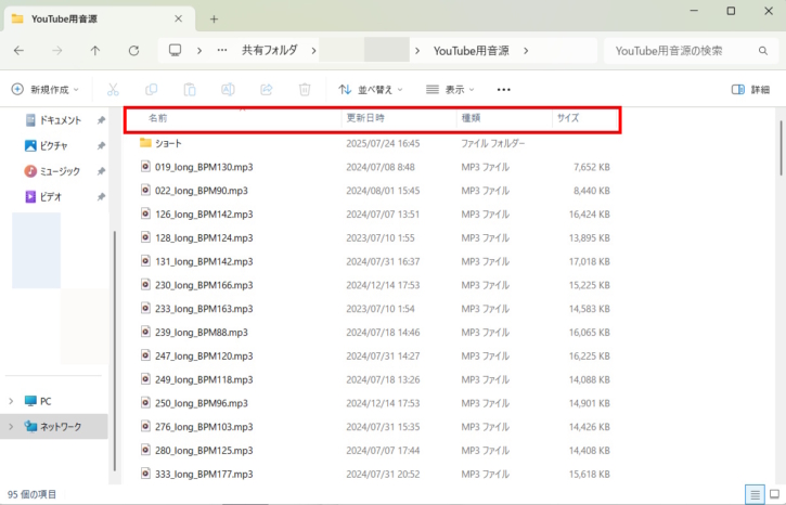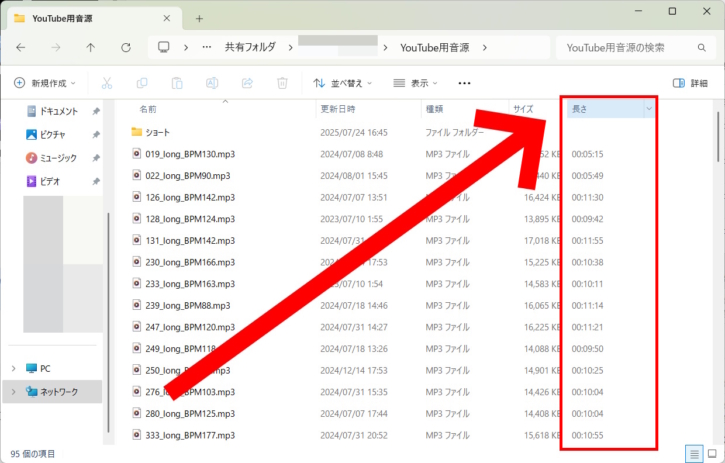 ここ最近動画編集する機会が多くなり、BGMフォルダから動画の尺に合いそうなBGMを探すことが多いのですが、Windows 11のデフォルトの状態ではエクスプローラ上に「ファイルの長さ」というのは設定しなければ出て来ません。