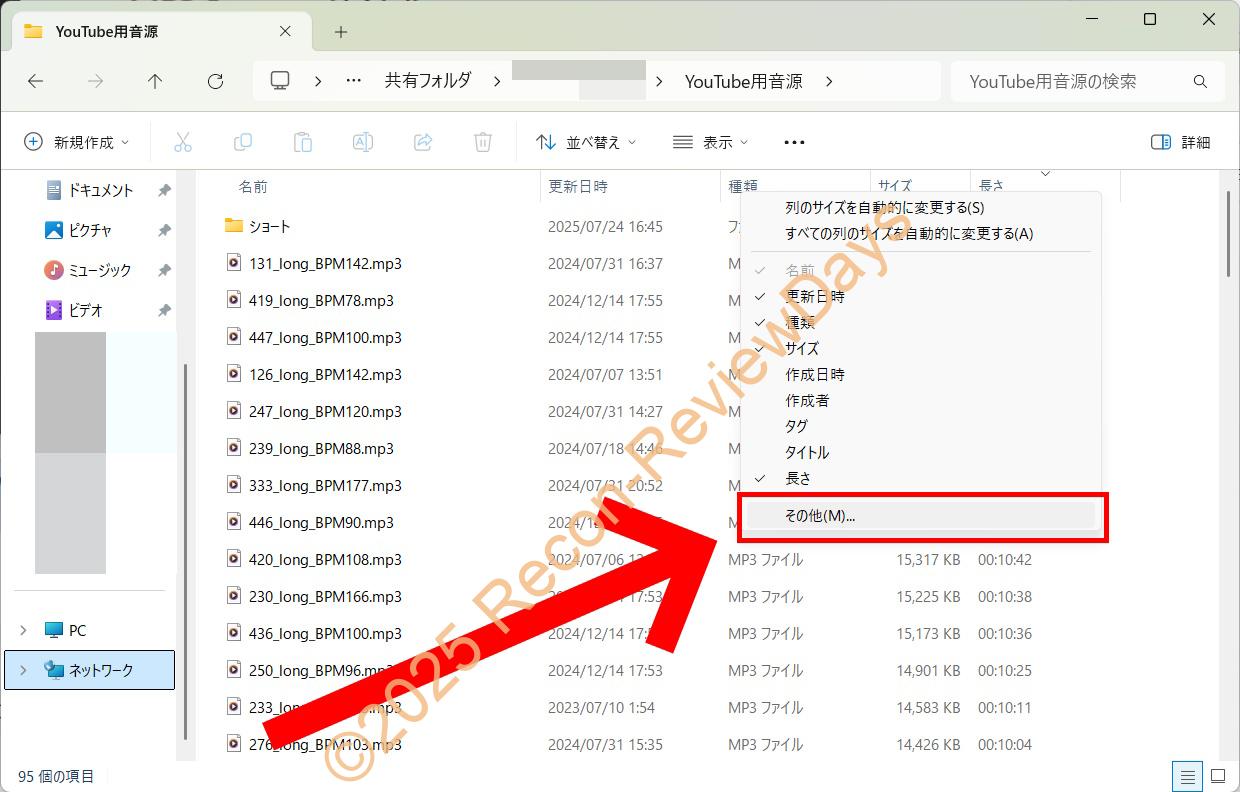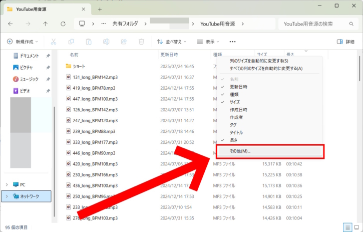 エクスプローラーの「カラムヘッダー」を右クリックして「その他」を開く