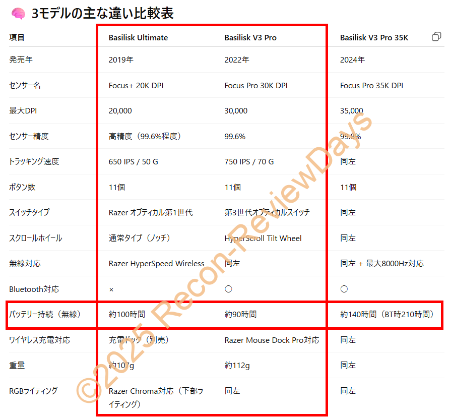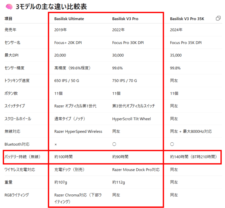 ChatGPTに纏めてもらいましたが、「Basilisk Ultimate Black」の場合は「約100時間」持っていたはずが「Basilisk V3 Pro」では「約90時間」と「約10時間」減っています。