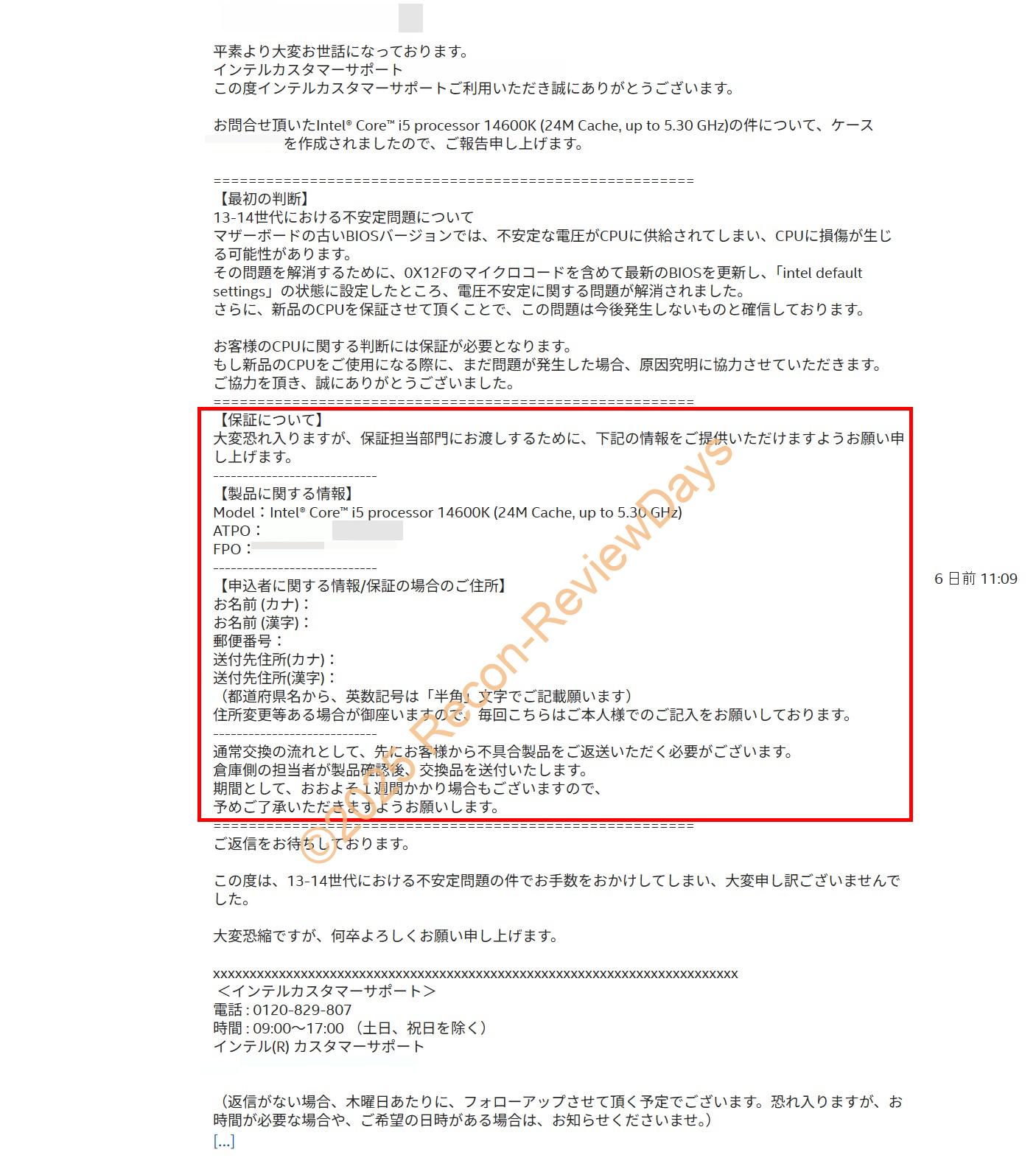 購入証明があったのでCPUも「Intel Support」からRMA依頼を掛ける