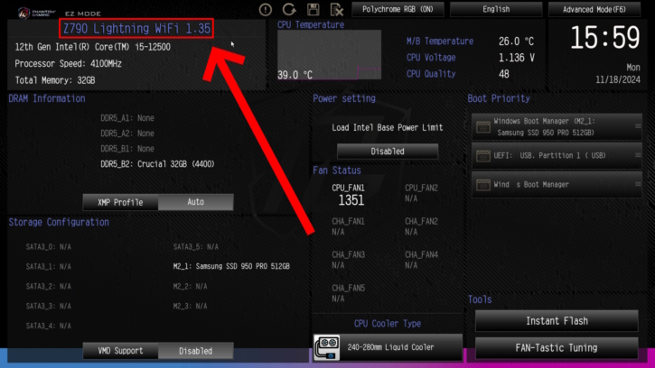 続いて「BIOSがどうなってるんや?」と思って確認してみると「Z790 Lightning WiFi(BIOS: 1.35 ※First released.)」。