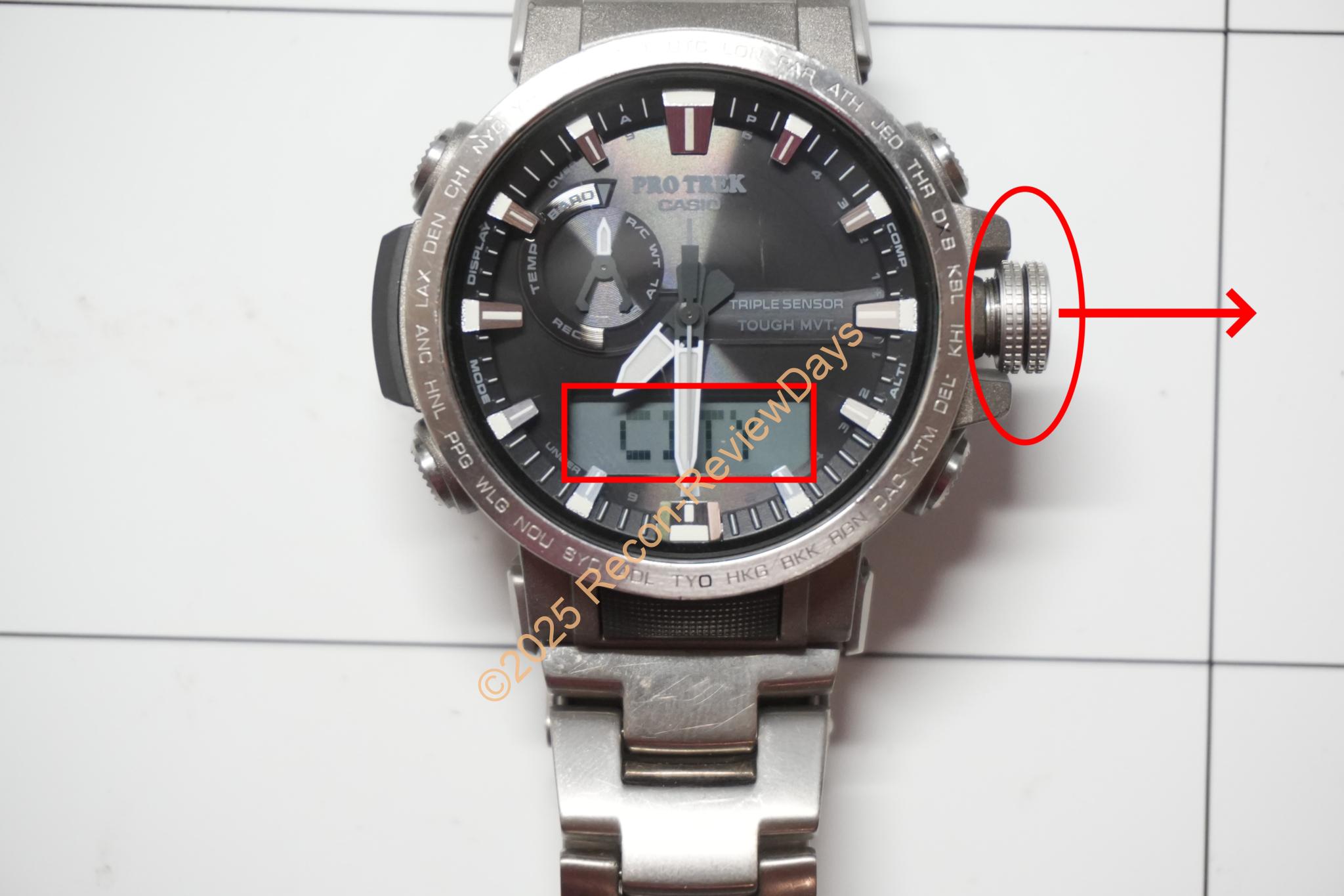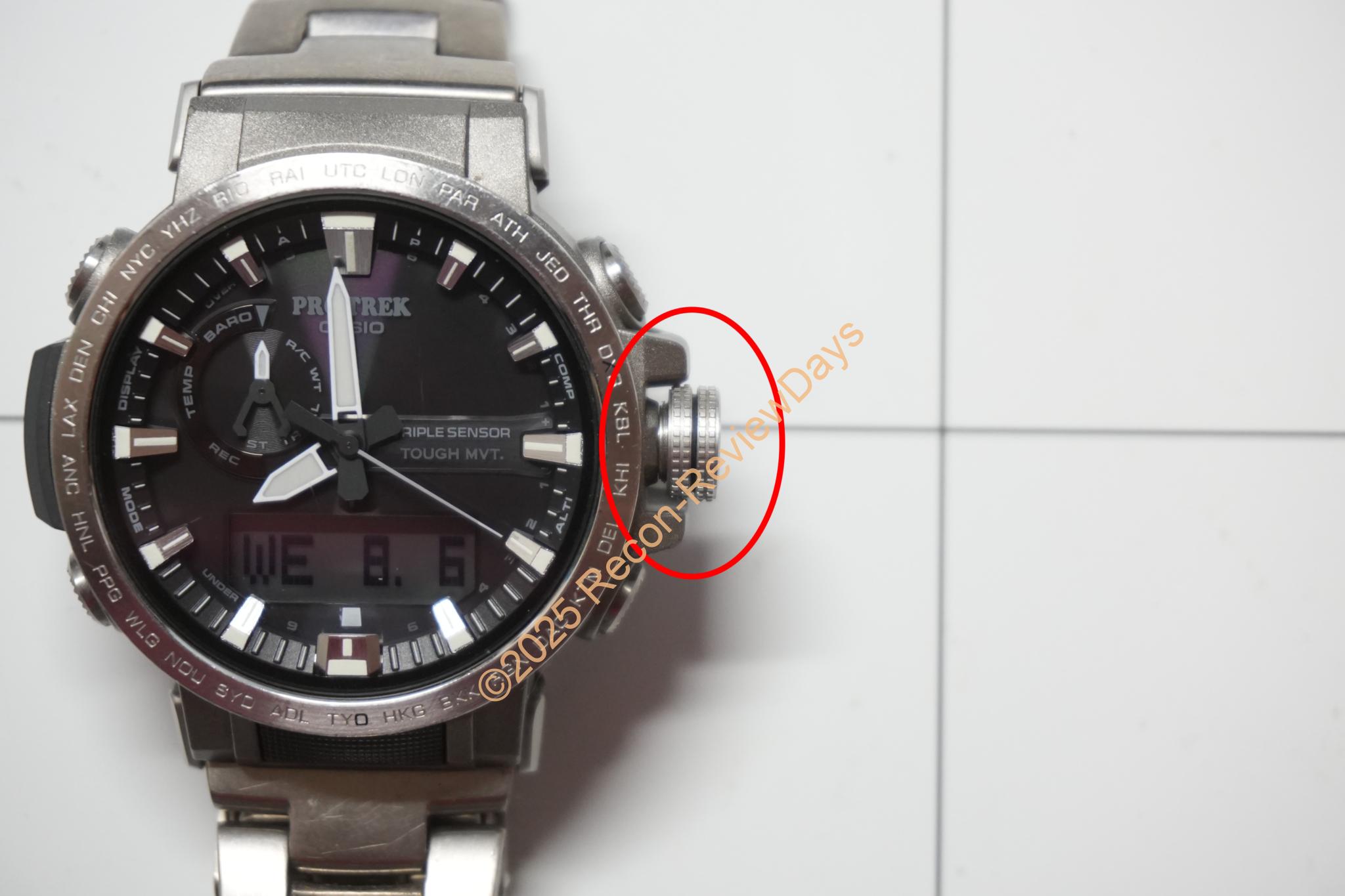 ・「PRO TREK PRW-60T」の竜頭(上記画像2枚目の赤丸)が完全に緩んでいた。