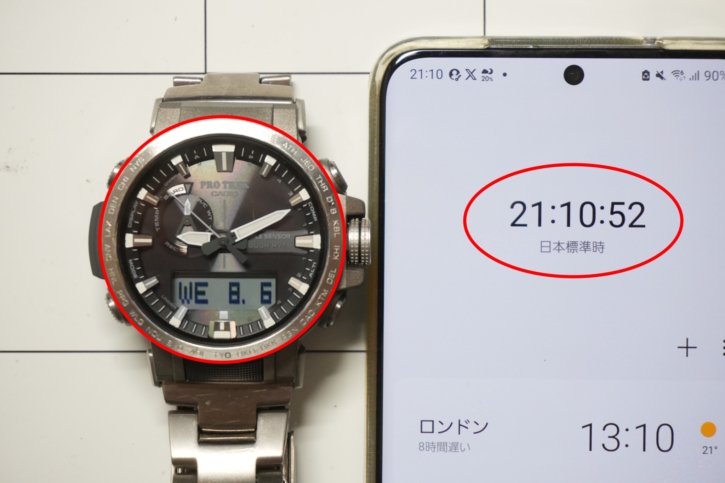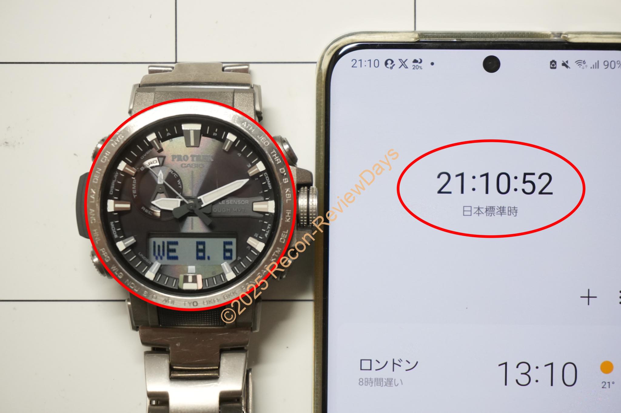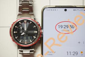 ・スマートフォン等のGPS、インターネットを用いた時間と「PRO TREK PRW-60T」が表示する時間を比較すると「キレイに30分のズレがある」。