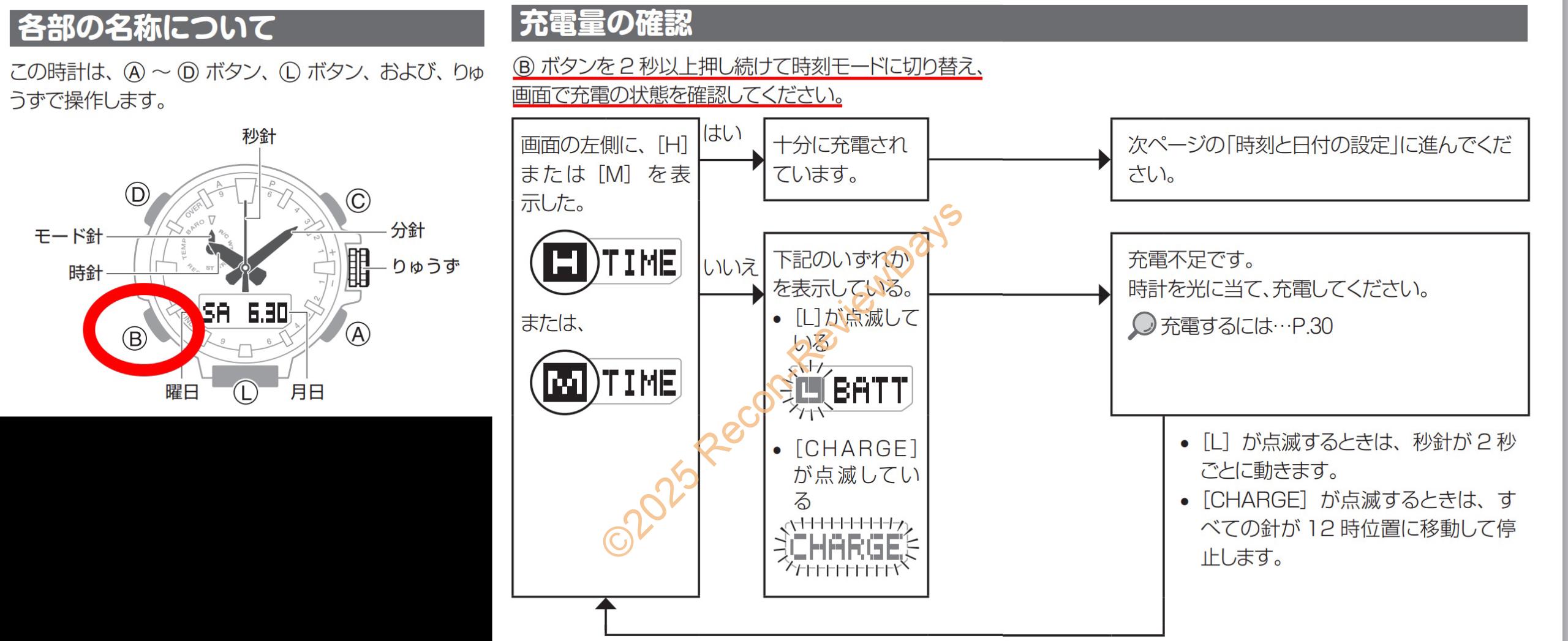 まずは「充電量の確認」を行うべく、「Bボタン(時計の左下ボタン)」を2秒以上押して「H: 十分に充電されている」と表示されているかチェックします。