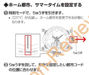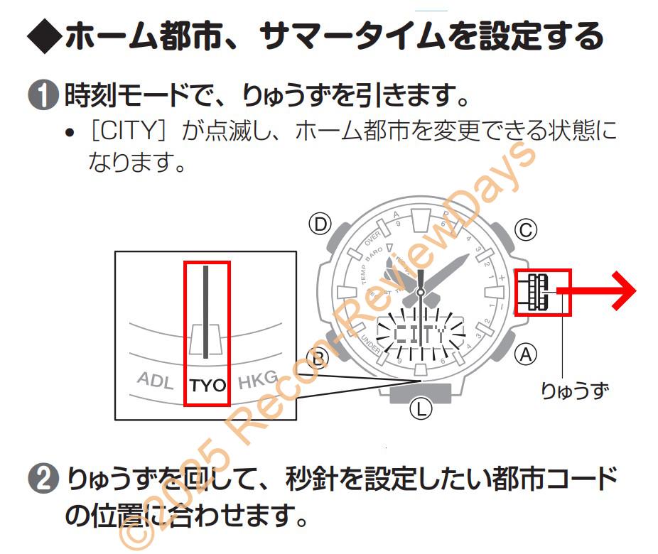竜頭を完全に緩めて「竜頭を右側に引っ張る」と「ホーム都市、サマータイムの設定(CITY)」に入れるので2枚目の画像の状態になります。