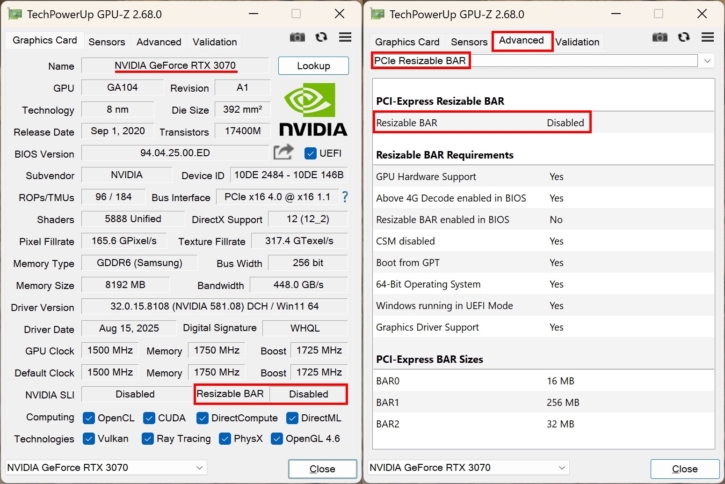 「GPU-Z」の場合は開いたGPUスペック一覧の下側にある「Resizable BAR: Disabled」 or 「Advancedタブ」→「PCIe Resizable BAR: Disabled」になっていることを確認。