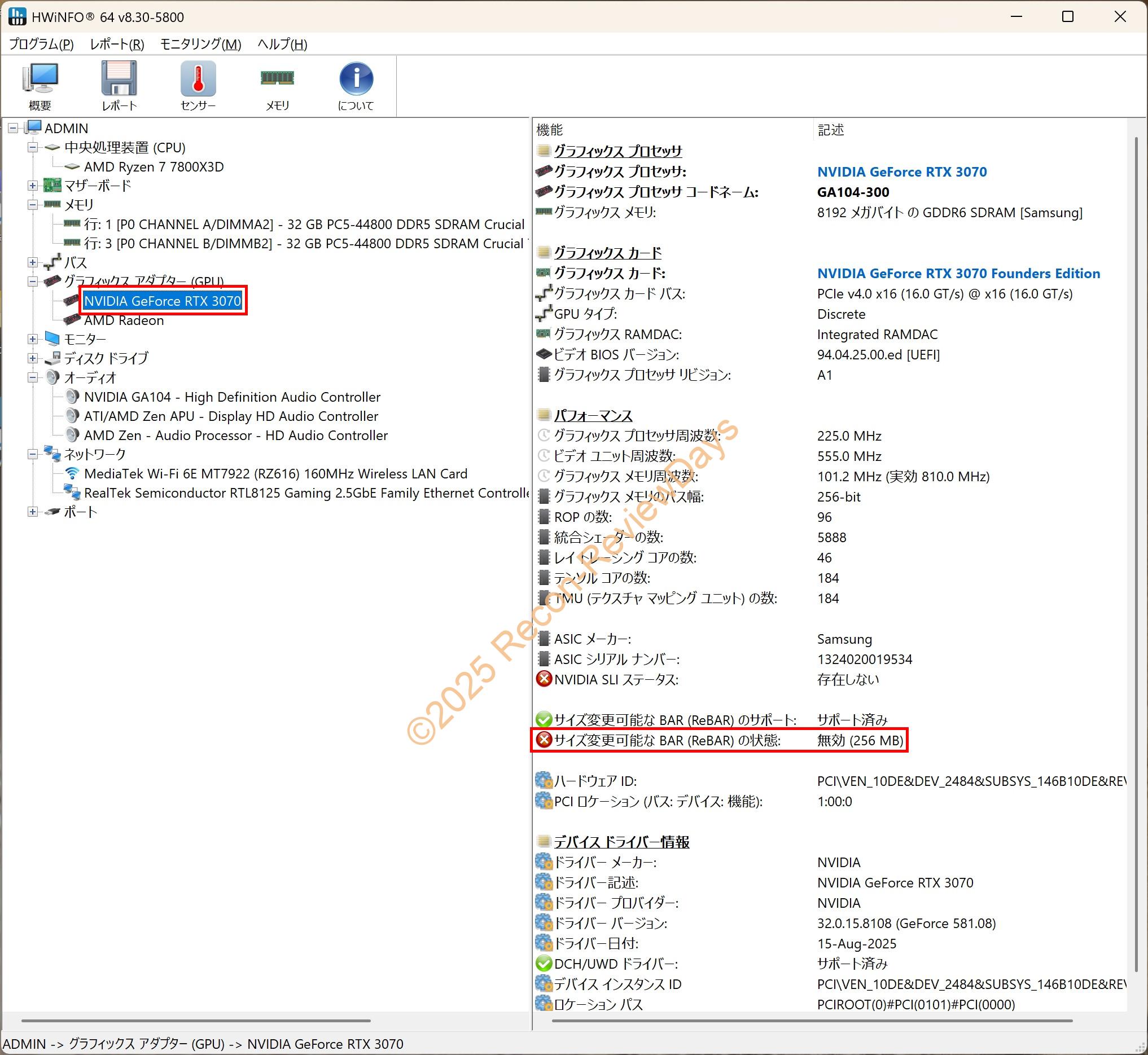 「HWINFO64」の場合は「グラフィックスアダプター(GPU)→サイズ変更可能なBAR(ReBAR)の状態: 無効」となっていることを確認。