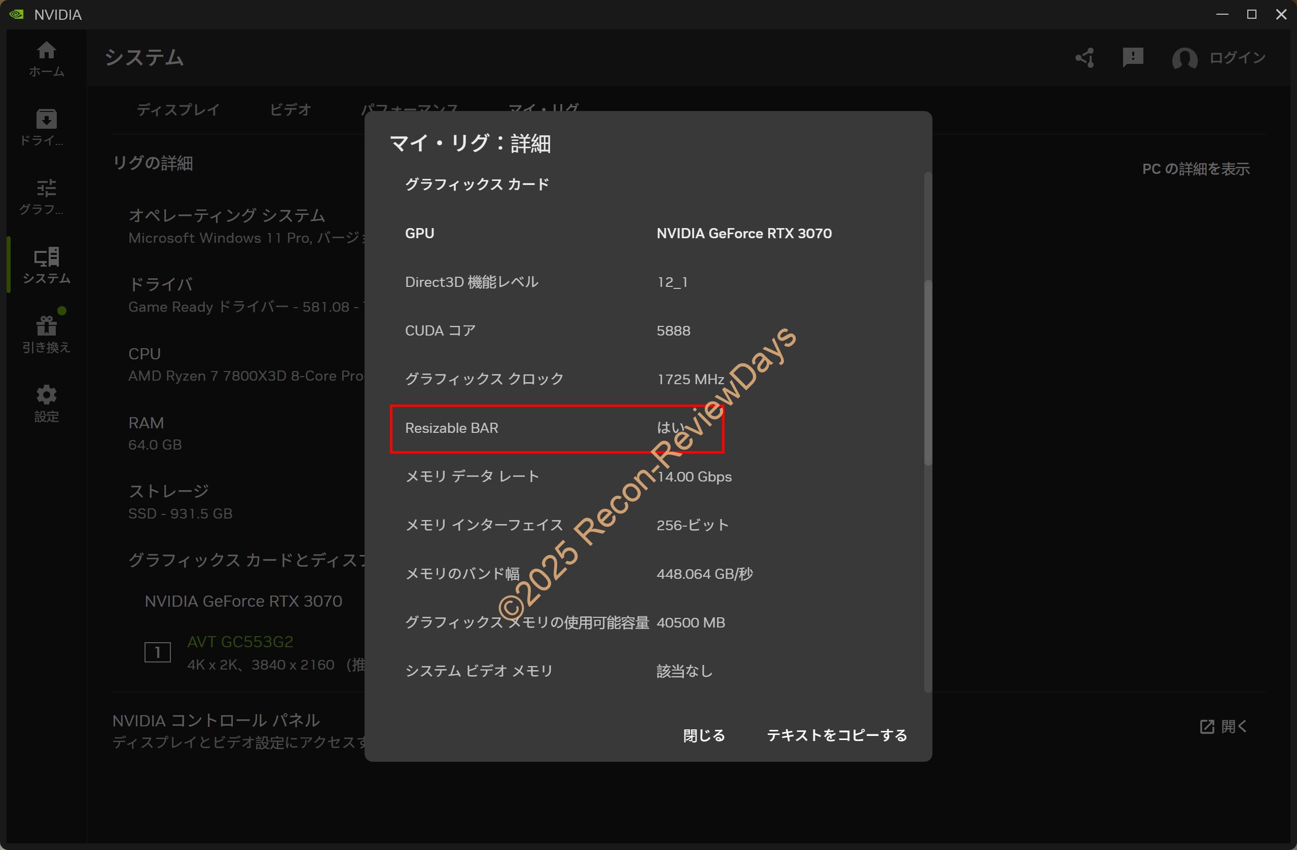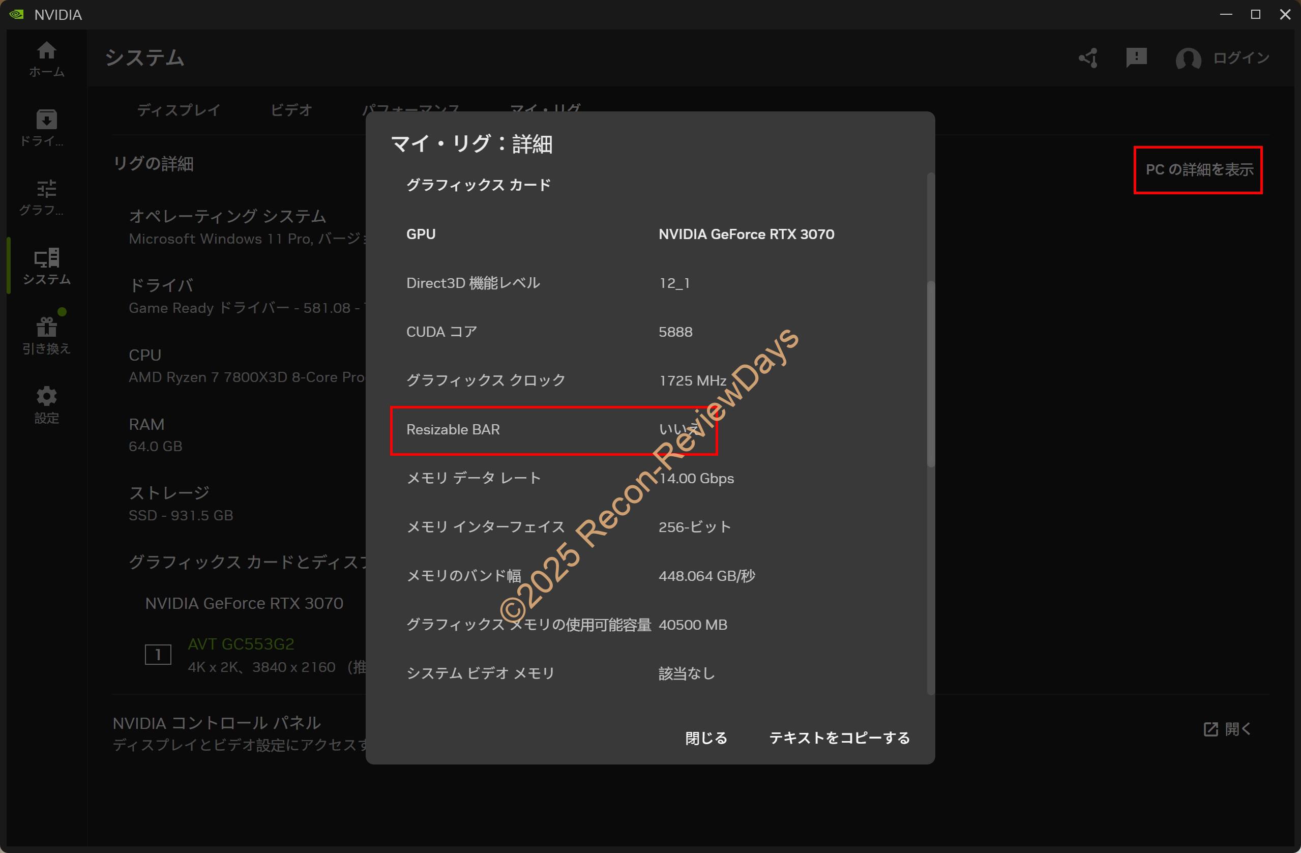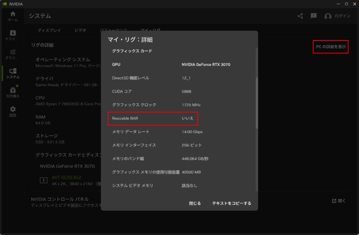追加でソフトを入れたくない方は「NVIDIA App→システム→マイ・リグ→PCの詳細を表示→Resizable BAR: いいえ」になっていることを確認。