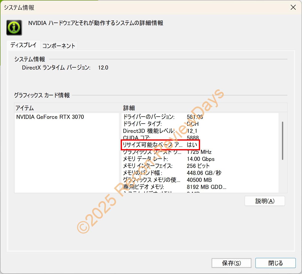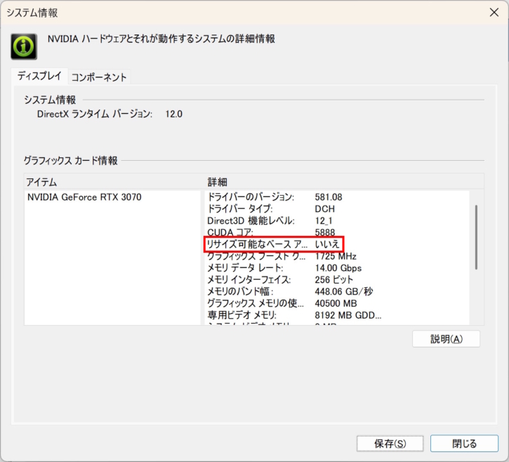 追加でソフトを入れたくない方はNVIDIAコントロールパネルで「デスクトップ右クリック→NVIDIAコントロールパネル→左下のシステム情報→リサイズ可能なベース アドレス レジスタが”いいえ”」になっていることを確認。