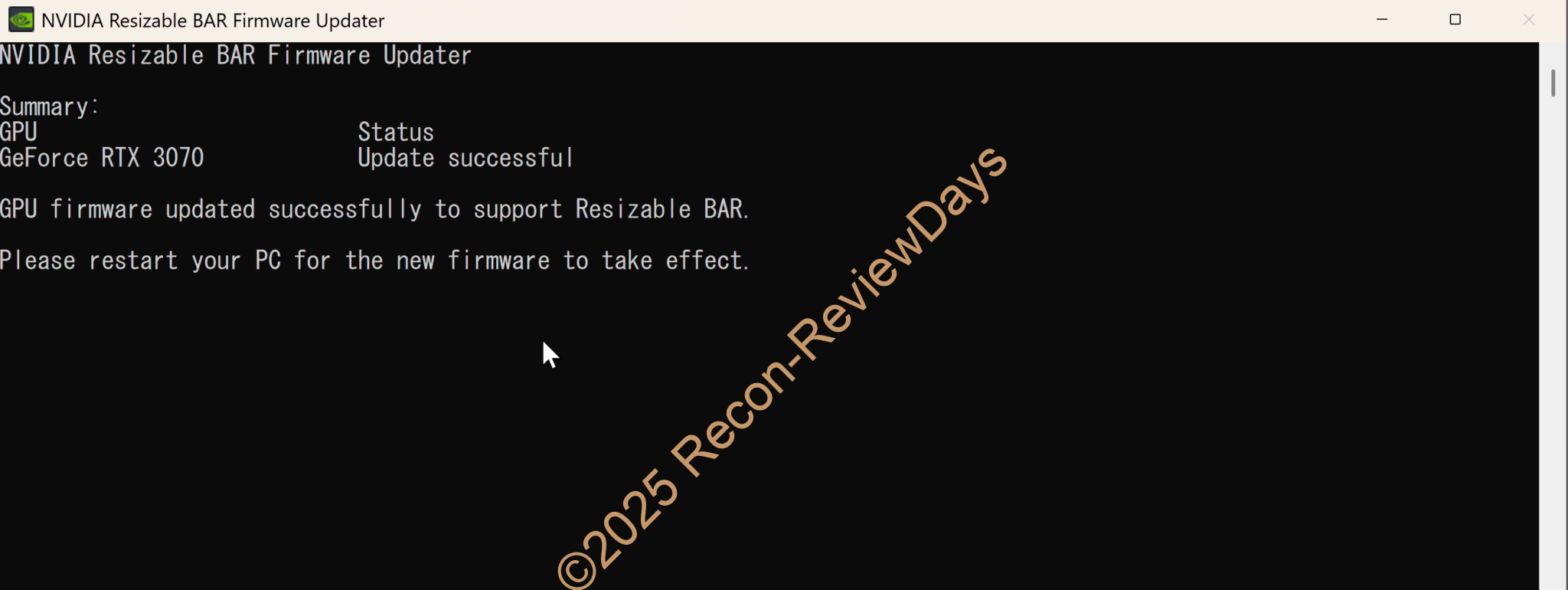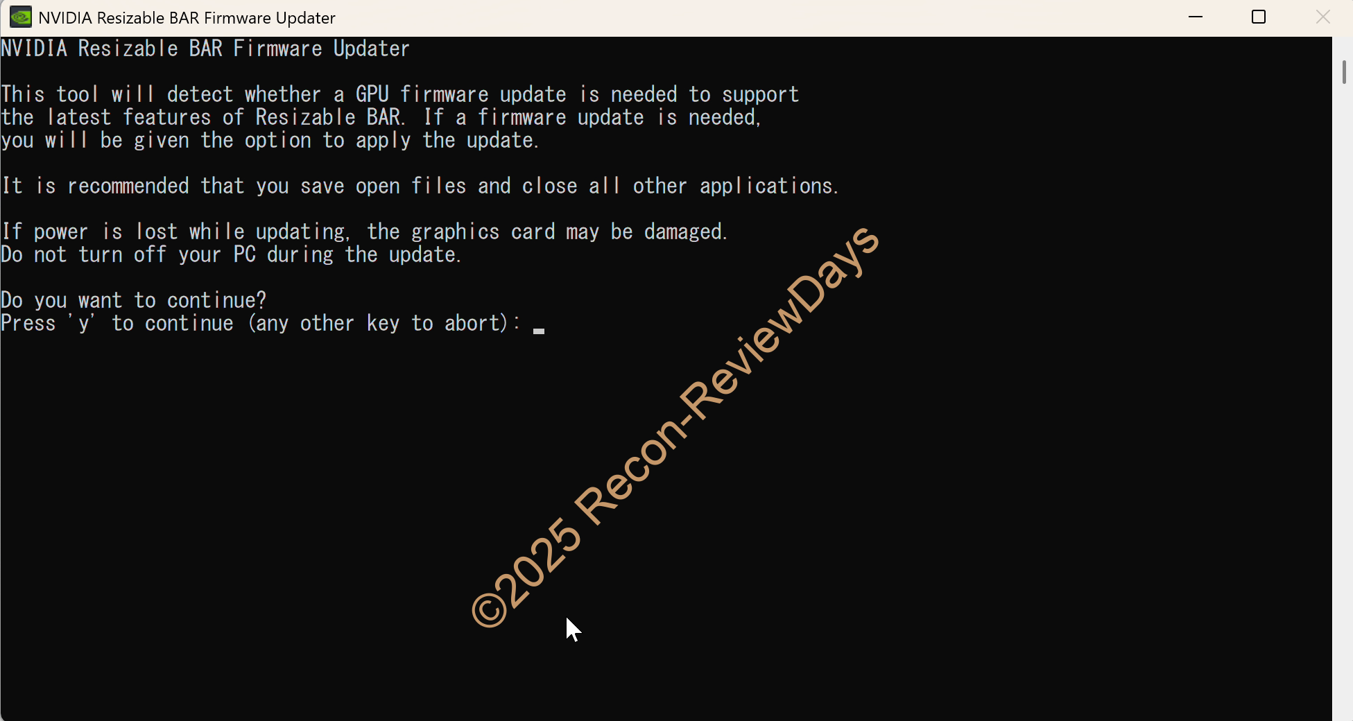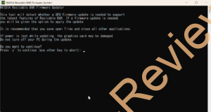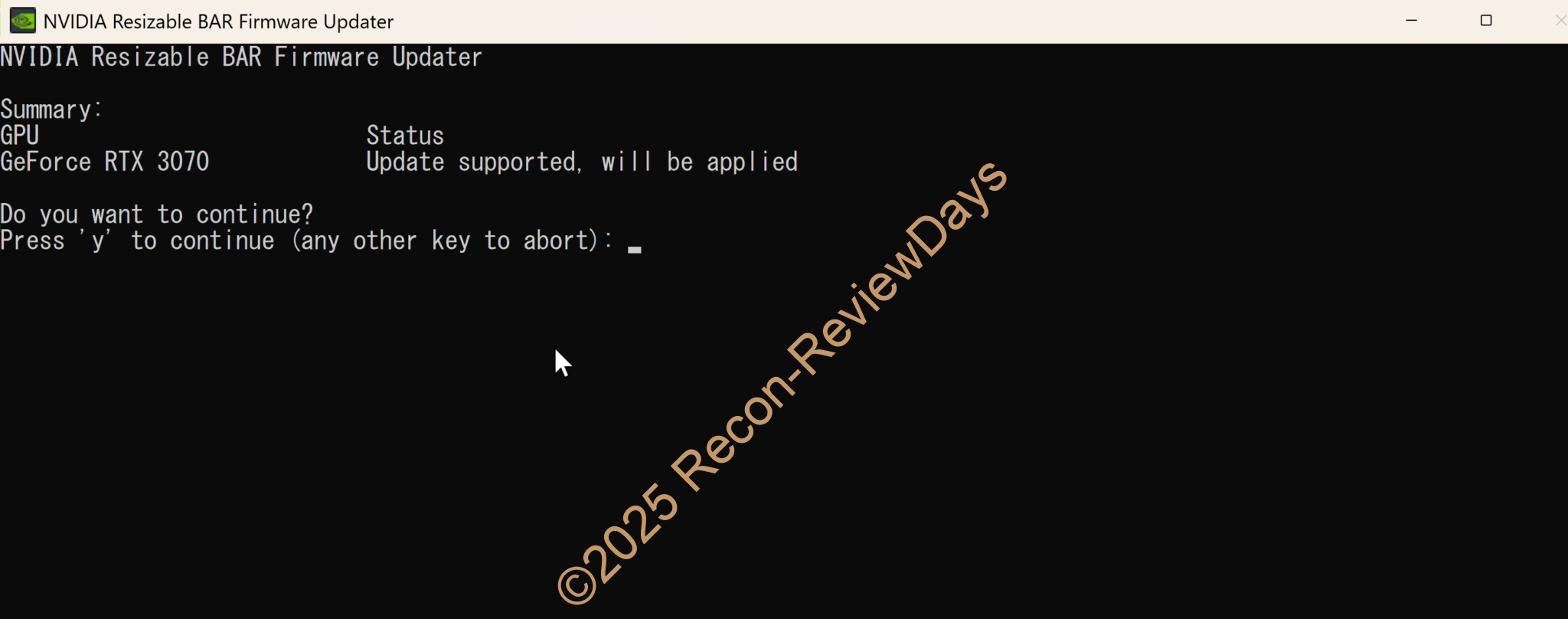 NVIDIA純正の「Founders Edition」の場合はNVIDIAが直接配布している「Resizable BAR Firmware Update Tool」をダウンロードして、キーボードで「y」を2回打つだけでほぼ完了するので非常に楽です。