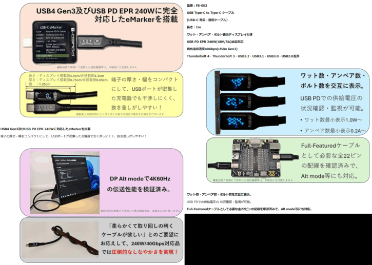 商品ページに記載されている内容を纏めましたが、「フルスペック(Full-Featuredケーブル)」になっており、とりあえずこのケーブルを1本持っていれば困る事はまず無さそうです。