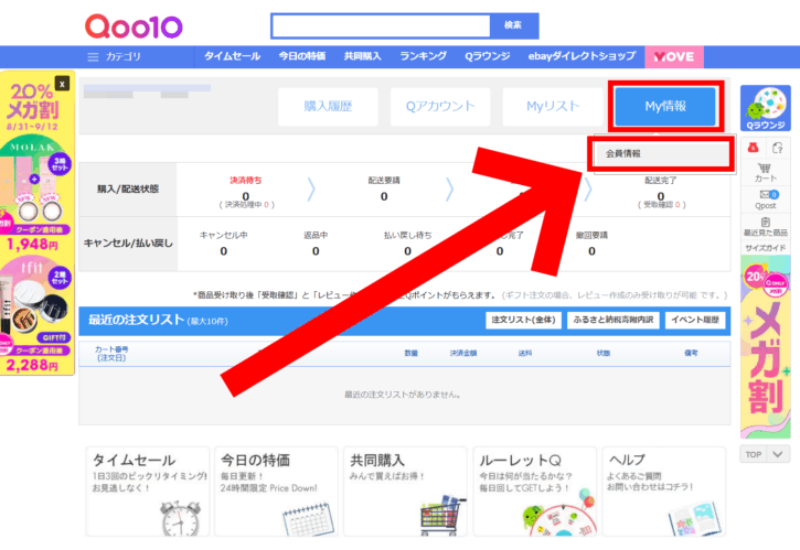 PCブラウザから「ログイン履歴」を調べる方法は「上記リンク」からQoo10トップページへと移動し、上部にある「My Qoo10」にアクセスしましょう。