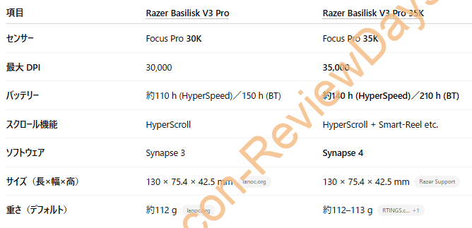 「Basilisk V3 Pro」と「Basilisk V3 Pro 35K」の差はセンサーが「30,000DPI → 35,000 DPI」に上昇、サイズや重量は全く同じなのにバッテリー容量が増加した影響で「110時間 → 140時間」に増加、「Synapse 3 → Synapse 4対応」等がメイン。