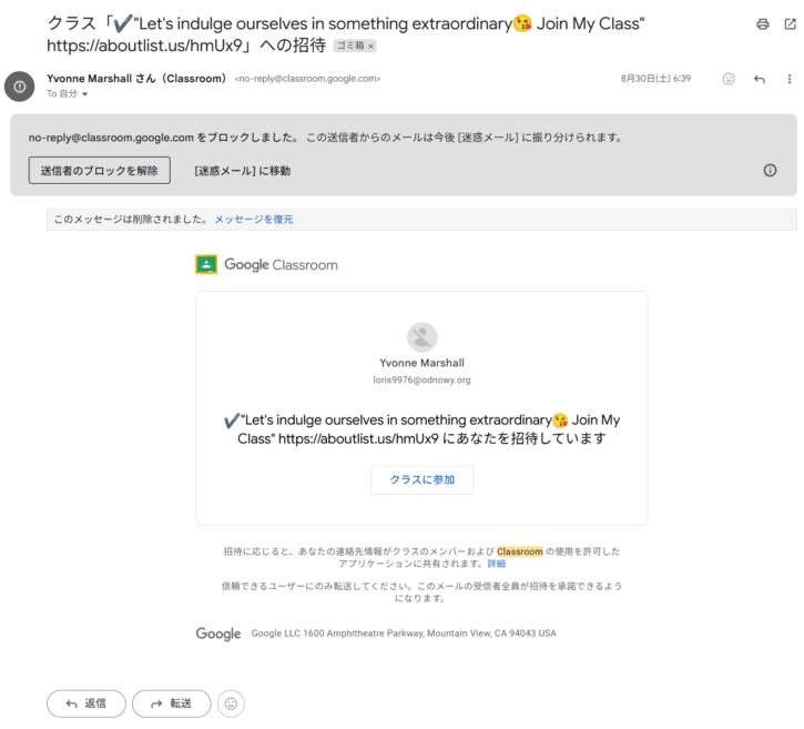 ここ最近Googleが提供している「Classroom」でどこかしらで得た個人情報を悪用し、「Classroom」の招待リンクをスパムURLと共に送ってくる嫌がらせが流行っています。