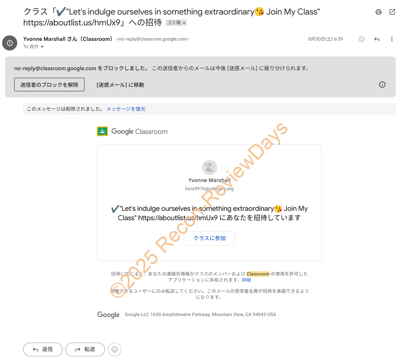 当方の場合は「Classroom」自体利用したことが無く、スパムを受信して初めてサービスを知ったぐらいで「Googleアカウントをお持ちの方であれば誰でもこの嫌がらせをされる危険性」が有ります。