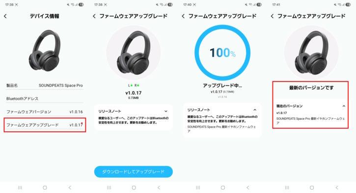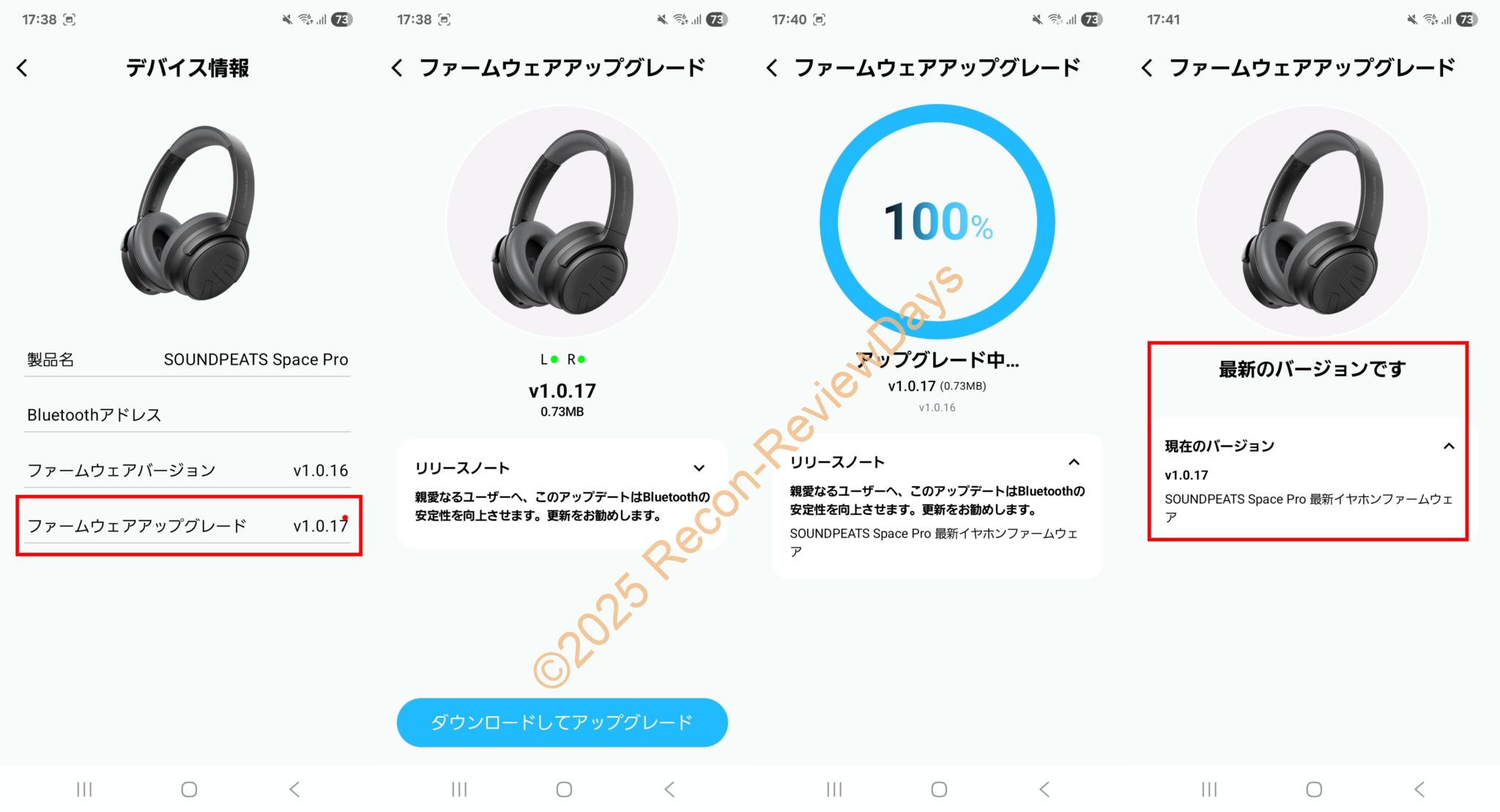 2025年9月15日現在「Space Pro」のファームウェアは「V1.0.17」が最新版で、筆者が入手した個体は1つバージョンが古い「v1.0.16」だったのでV1.0.17へアップデートをすることが出来ました。