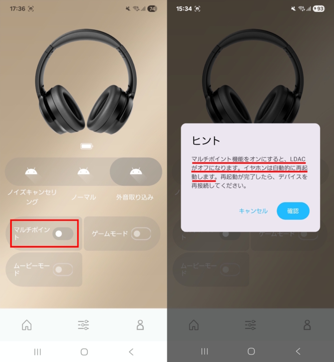 アプリ「PeatsAudio」から「マルチポイント」をONにした場合「LDACが自動的にオフ」となり、ヘッドホンの再起動が必要となります。