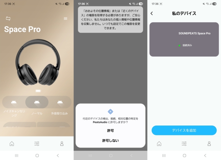 アプリ立ち上げ時に「Bluetoothでデバイスの検出、接続、相対位置の許可」さえ行えば自動的に機器を検索し、設定類が行えるようになります。