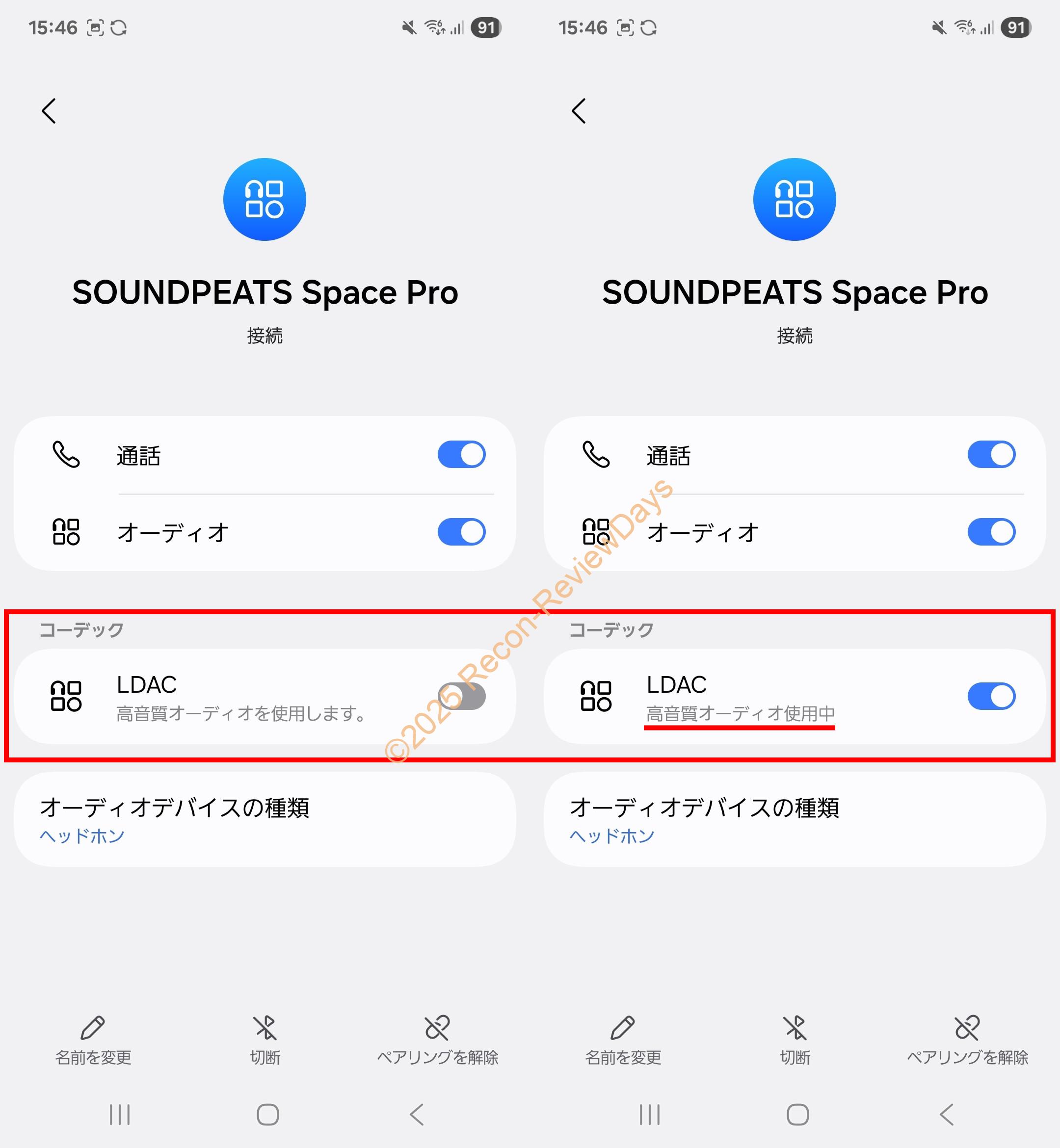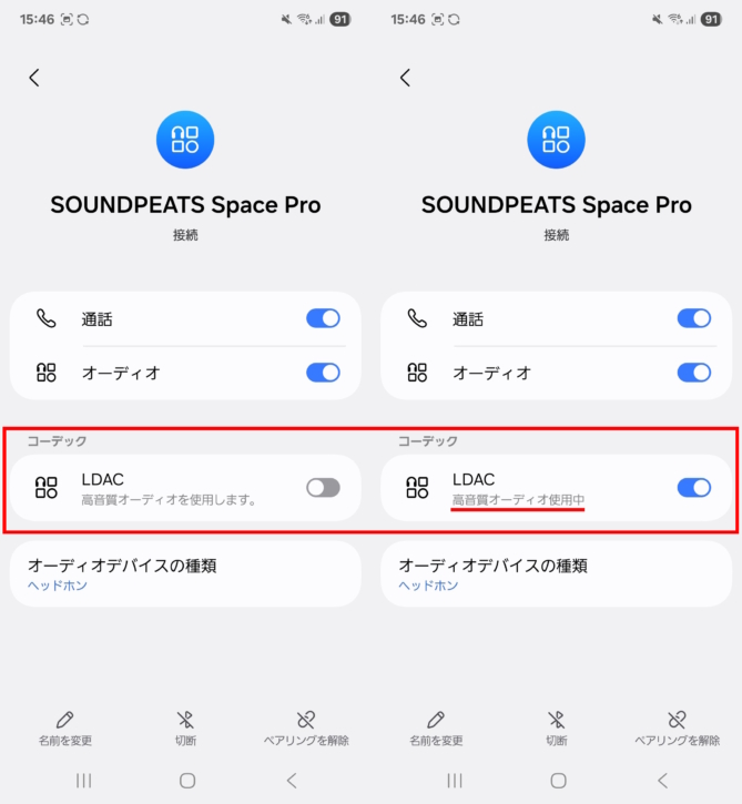 「Space Pro」の高音質化を体験した場合は「LDACをON」をお忘れずに。