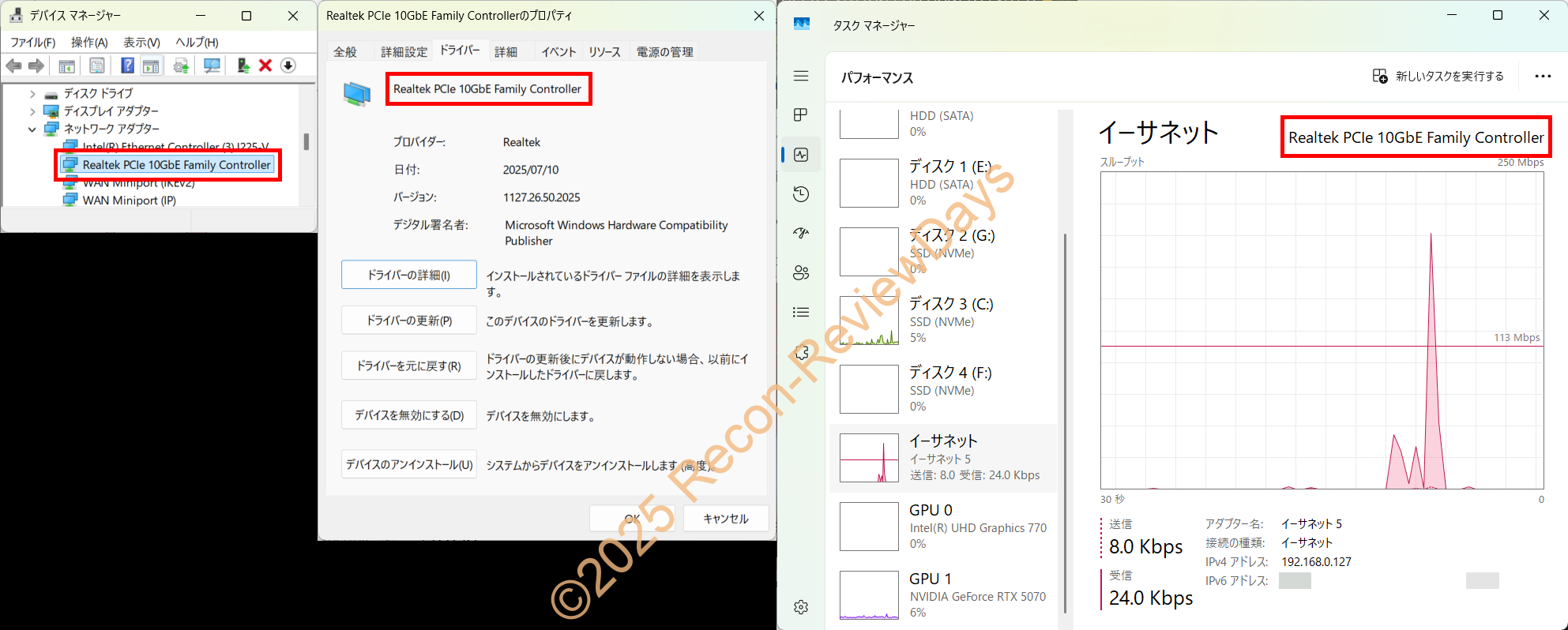 右: ドライバーインストール後(1127.26.50.2025、10GbE接続)