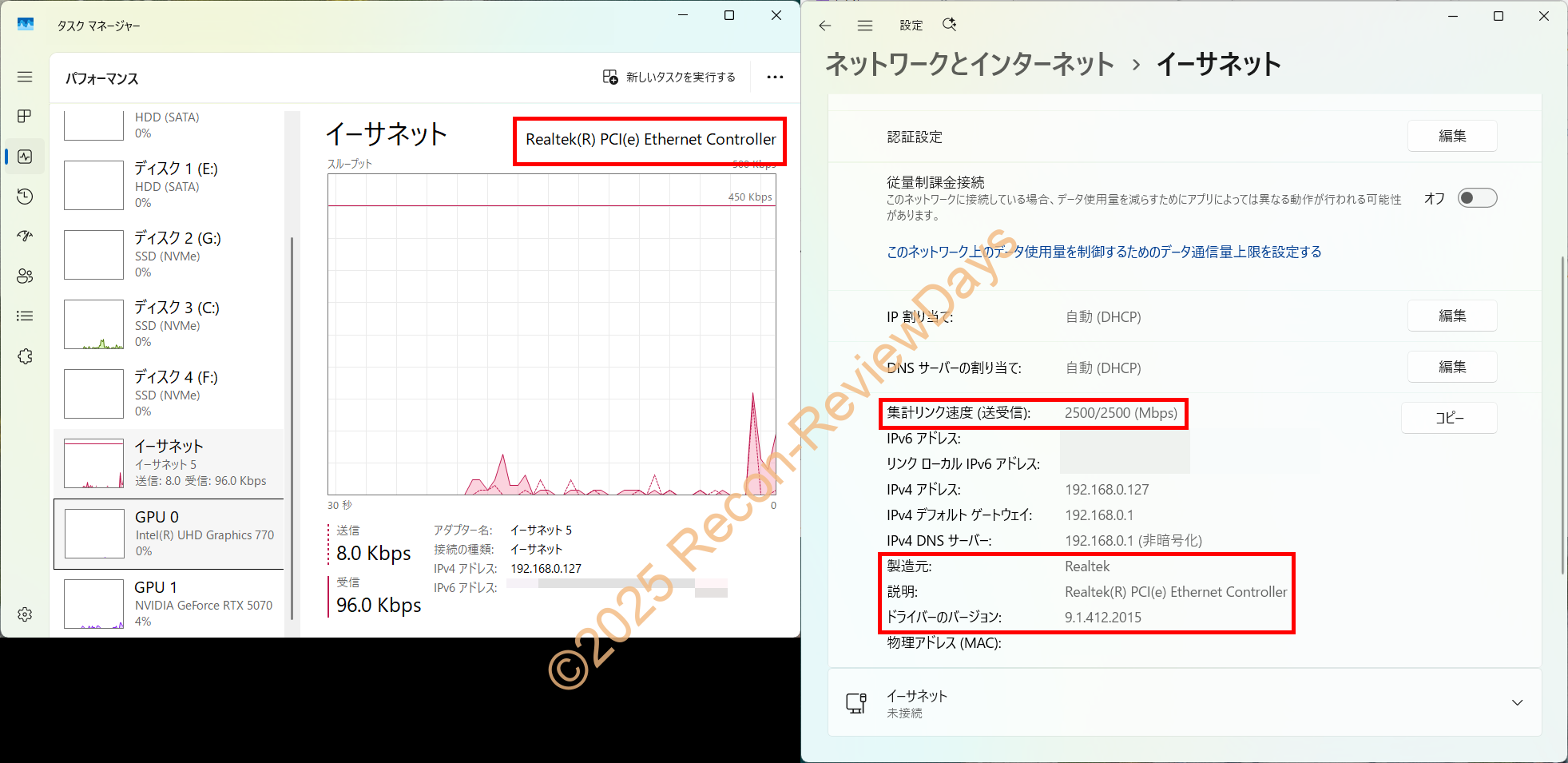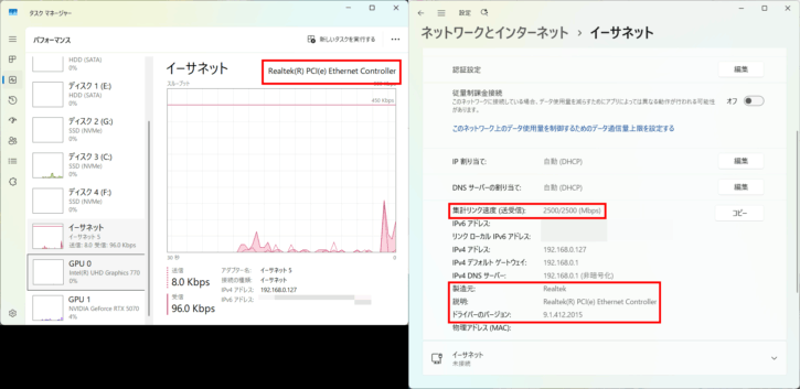 左: ドライバーインストール前(Win11 24H2標準、2.5GbE接続制限)