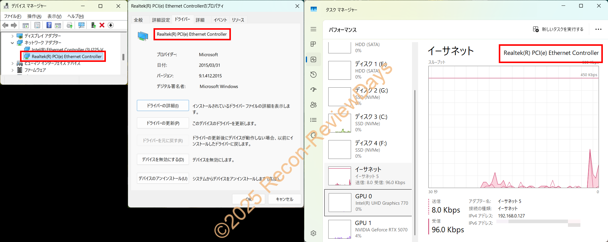 因みに「Win11 24H2内蔵の標準ドライバー(9.1.412.2015、2015年3月31日)」ではデバイスマネージャー、タスクマネージャー上の名称が「Realtek(R) PCI(e) Ethernet Controller」になっており、紛らわしい名称となってしまうので、必ず「上記リンク」より新しいドライバーのインストールを推奨します。