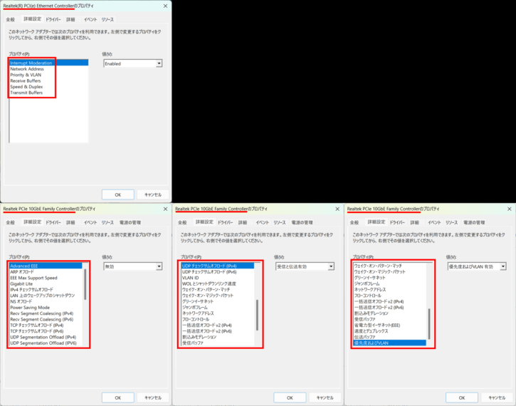 「Win11 24H2内蔵の標準ドライバー(9.1.412.2015、2015年3月31日)」のままの場合、NICの設定項目も大幅に異なります。