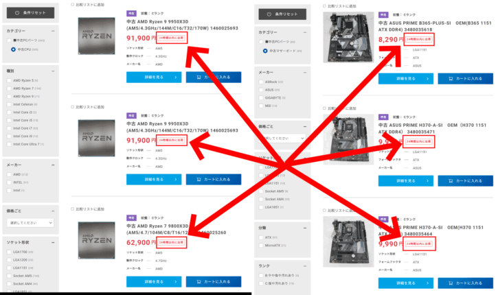 店頭で販売されている地方在庫の中古商品類は総じて「5日で出荷」になっており、特にPCパーツ系の多くは「店頭販売分で5日掛かる事が多い」という点に注意が必要です。