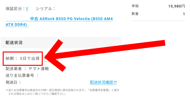 筆者が購入したのは某店で販売されていた店頭販売品の中古PCパーツ(マザーボード)で、納期が「5日で出荷」という部分を見落としていました。