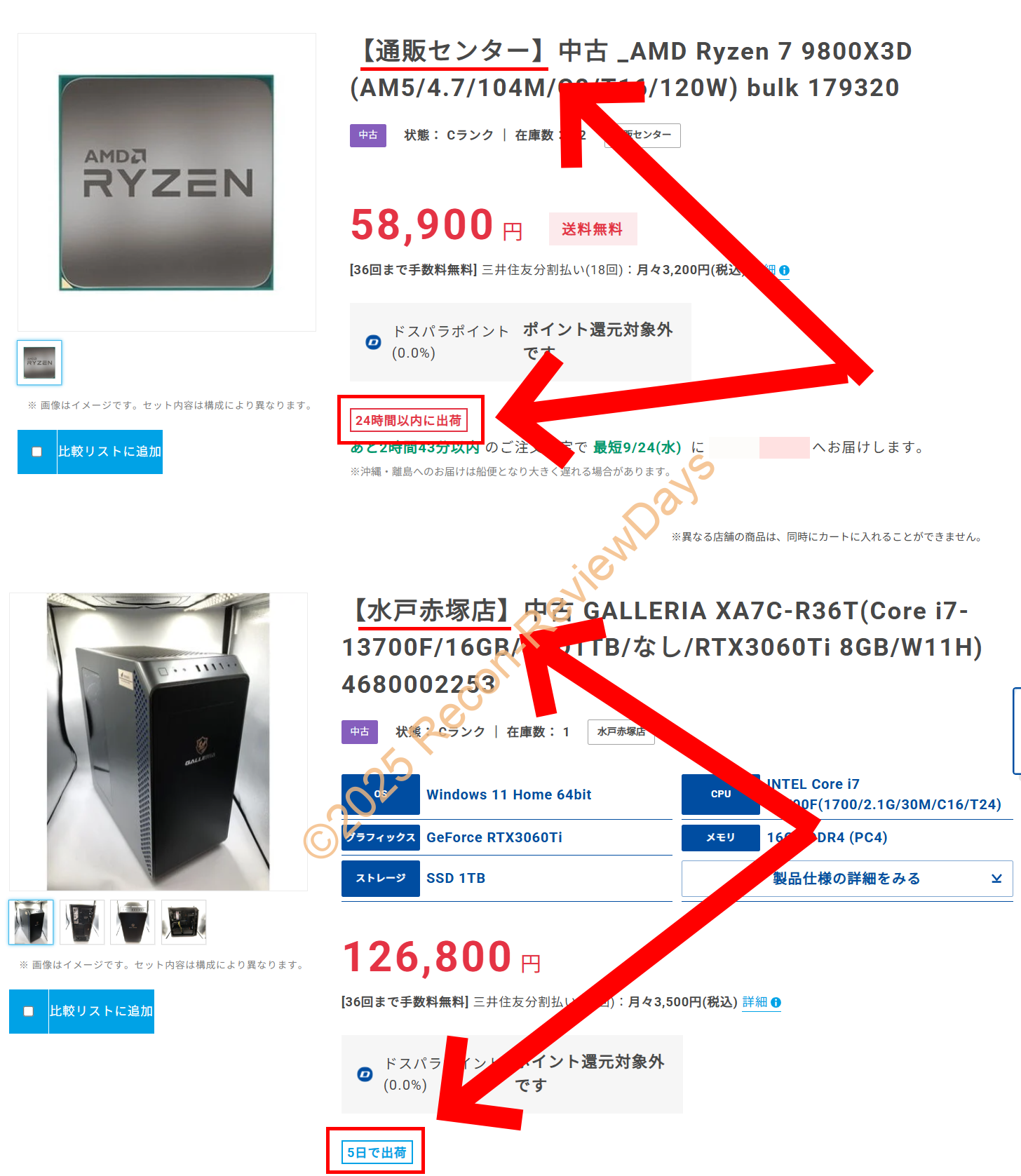 ドスパラの中古Web通販の場合、納期が「24時間以内出荷」と「5日で出荷」という2つのタイプがある模様です。