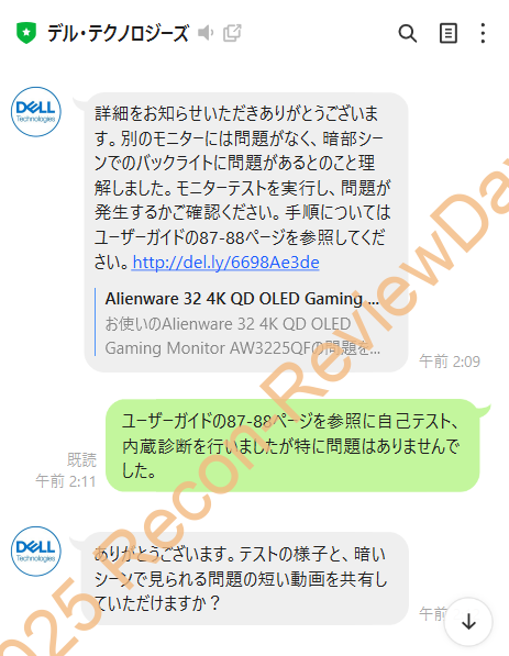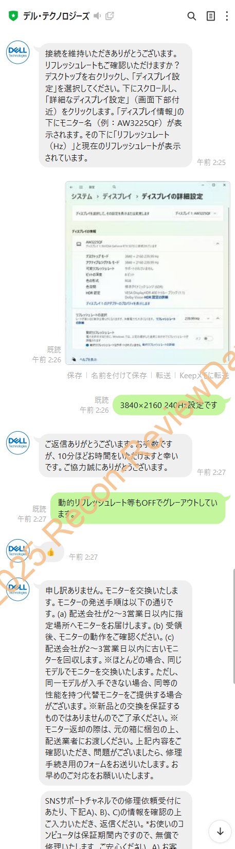 ここ最近DELL製のディスプレイ「Alienware AW3225QF」の調子が悪く、LINE経由でディスプレイの修理(RMA)の依頼を深夜に依頼しました。