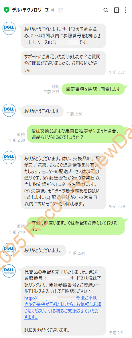 ディスプレイの不具合情報及びトラブルシューティングを試していく内に「ディスプレイの交換対応」となり、「会社名 or 名前、電話番号、部品発送、返送先住所、RMA交換品名/型番」等LINEチャット上で入力後、「ケースID、代替品の参照番号」が発行され、交換品の到着を待つのみとなりました。
