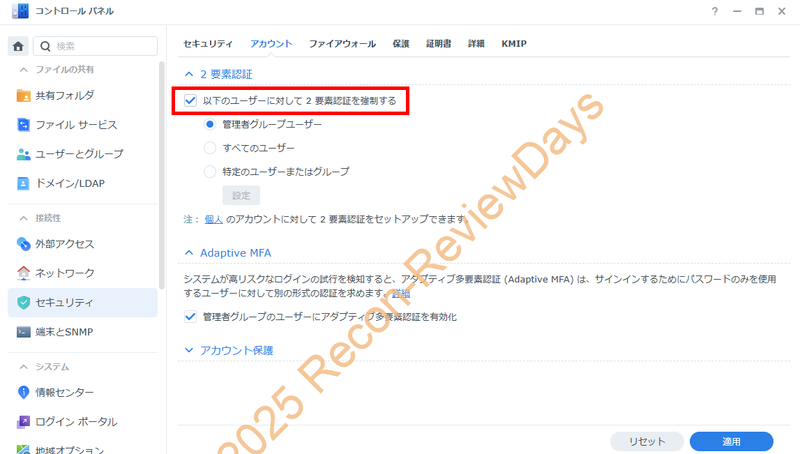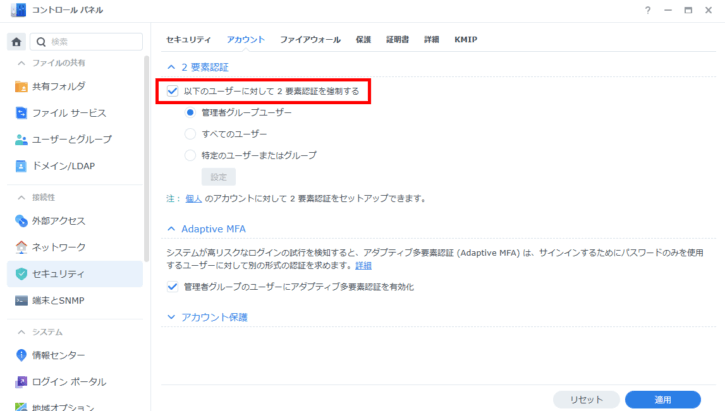・コントロールパネル → セキュリティ → アカウント → 2要素認証 → 以下ユーザーに対して2要素認証を強制するにチェック