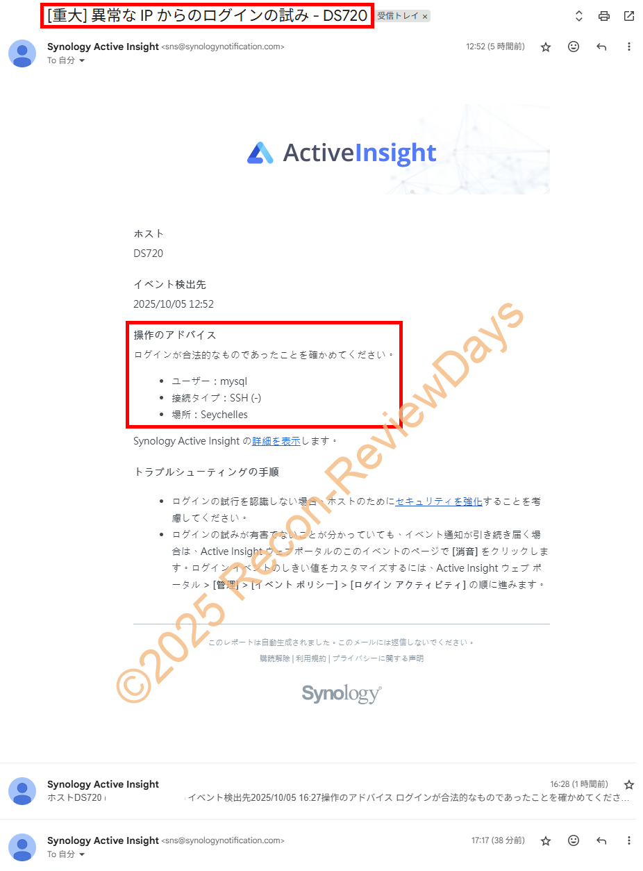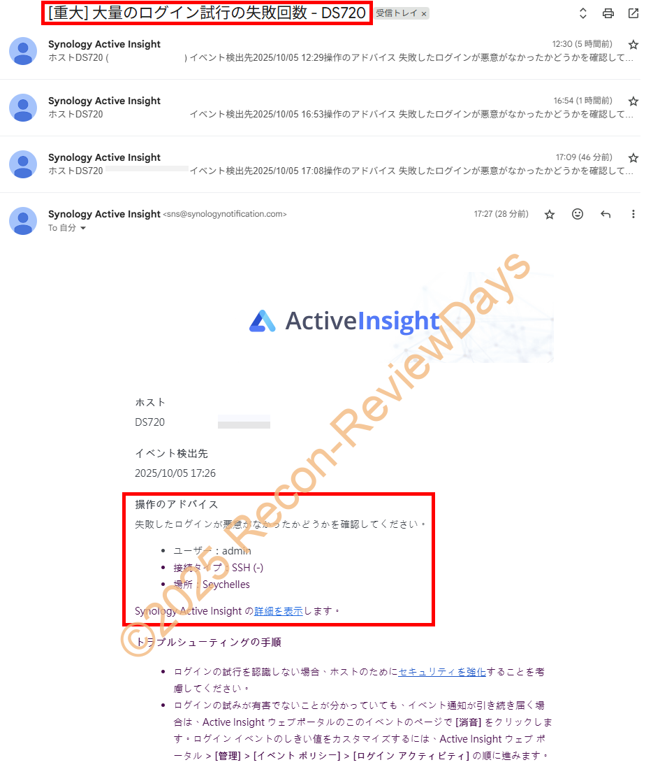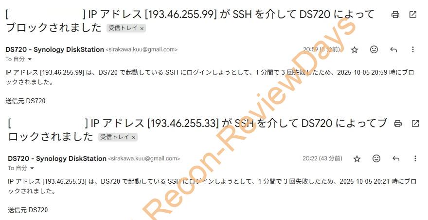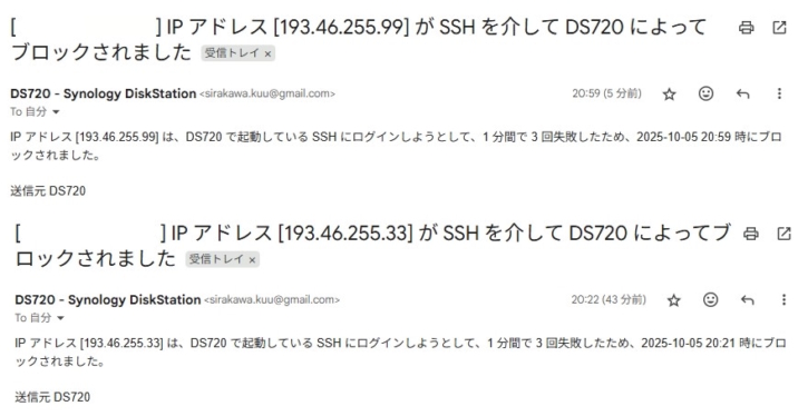 上記「複数回のログイン失敗時の接続拒否設定」を設定後、既に2件も「IP アドレス [193.46.255.33] が SSH を介して DS720 によってブロックされました」というメールが来ており、効果は大有りな様子。